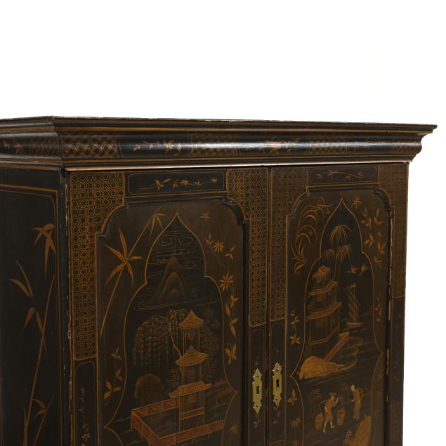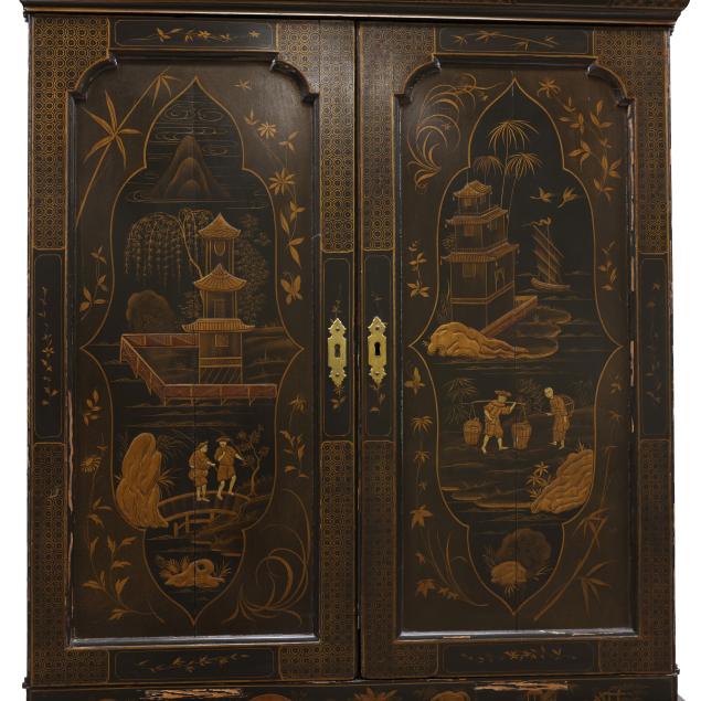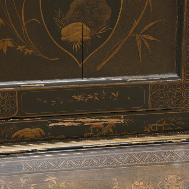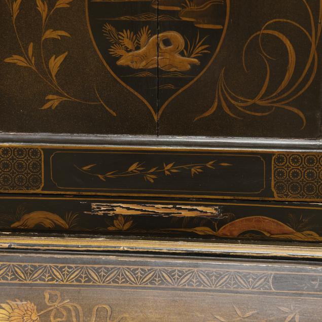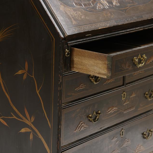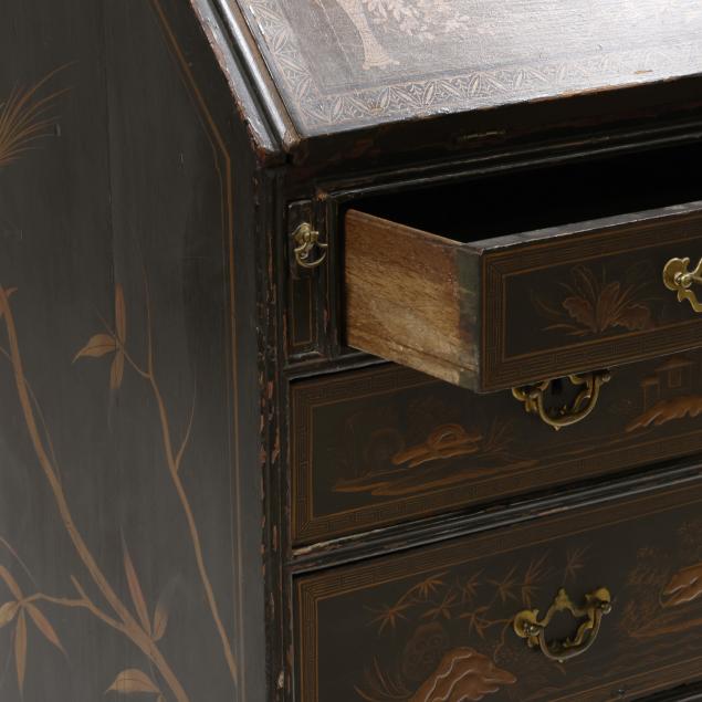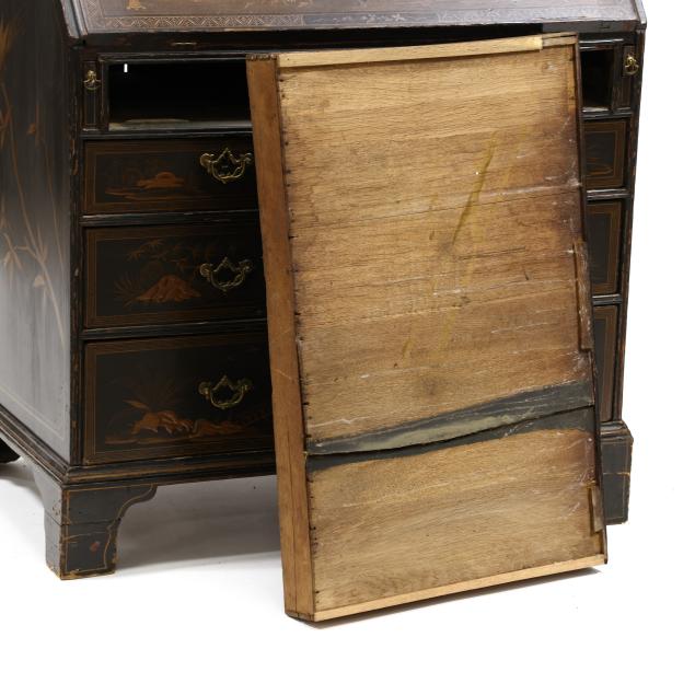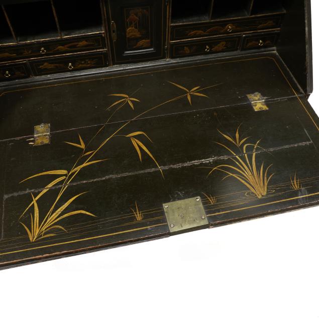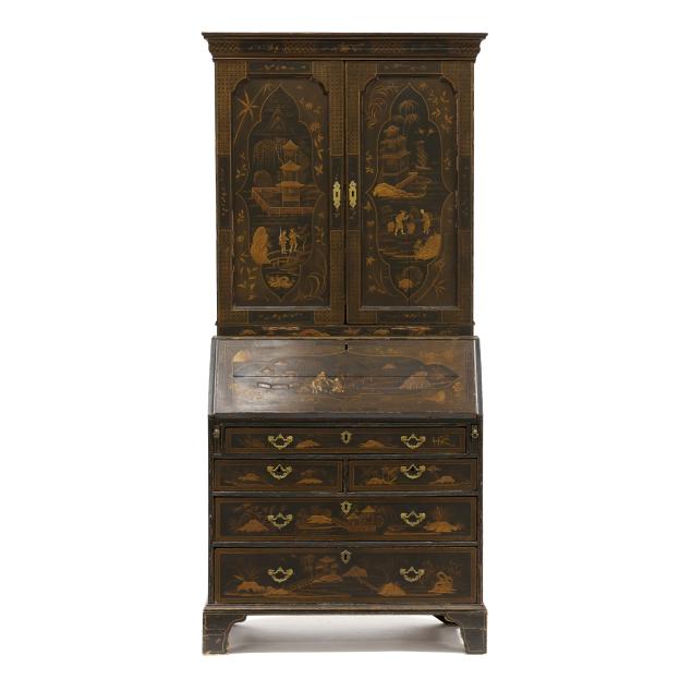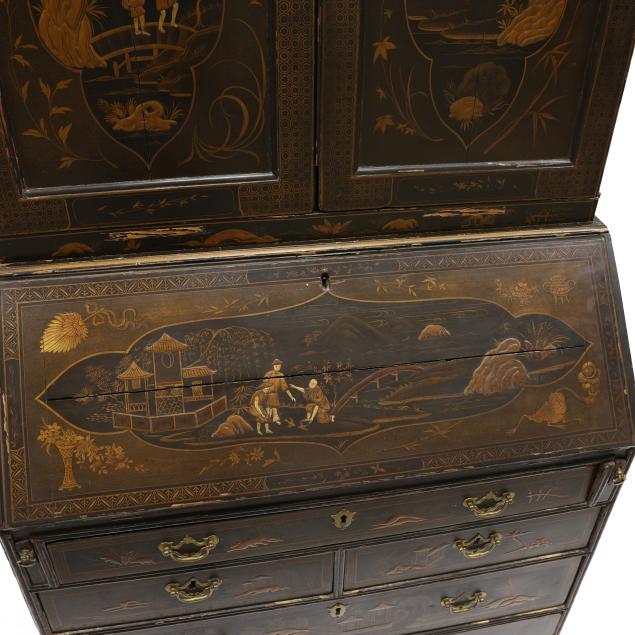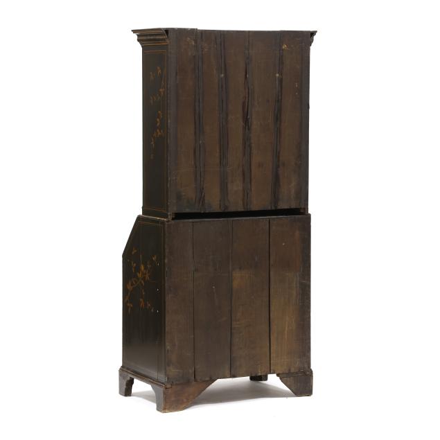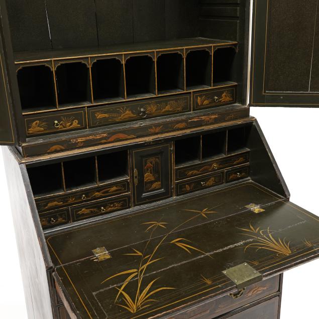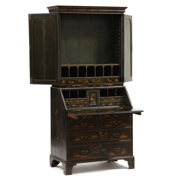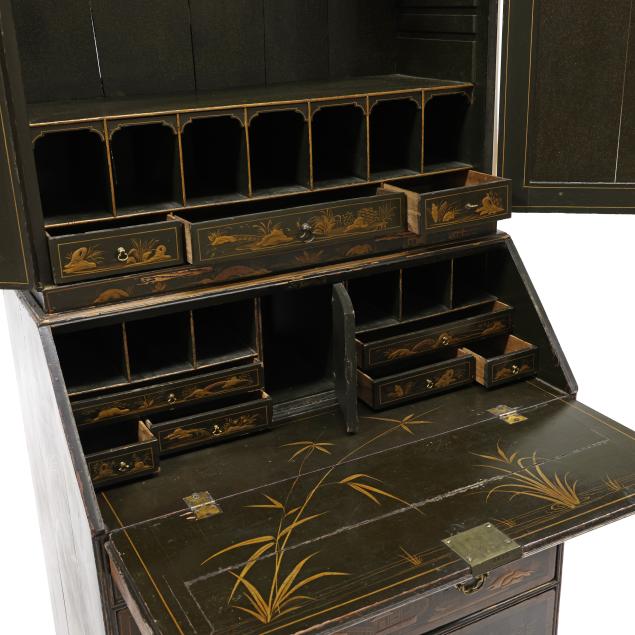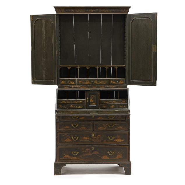 18th century, oak, two part form, upper bookcase with molded cornice, two hinged shaped paneled doors, interior with louvered compartments over seven valanced pigeon holes and three small drawers, the bureau with fall front lid having molded edge and lopper supports opening to reveal a central prospect door flanked by three pigeon holes over six small drawers, the case with one over two over two graduated drawers with reeded stile surrounds, flush case sides, straight bracket foot base, the whole with dark green / black field, raised gilt and lacquer decorations in the Chinese taste.