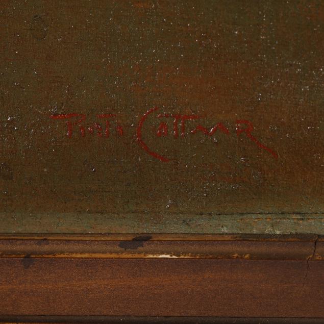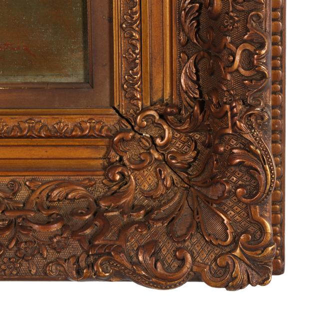 Oil on canvas, signed at lower right, presented in an ornate gilt frame.