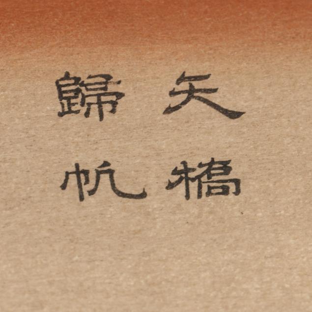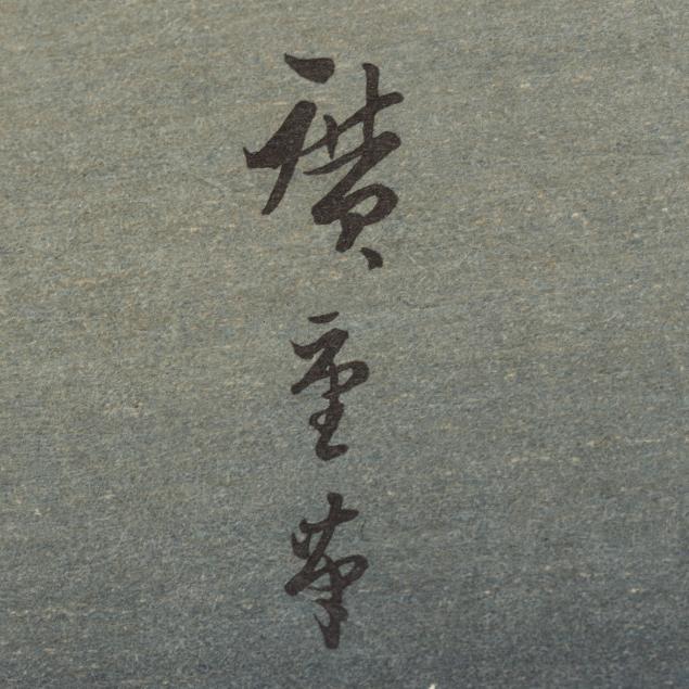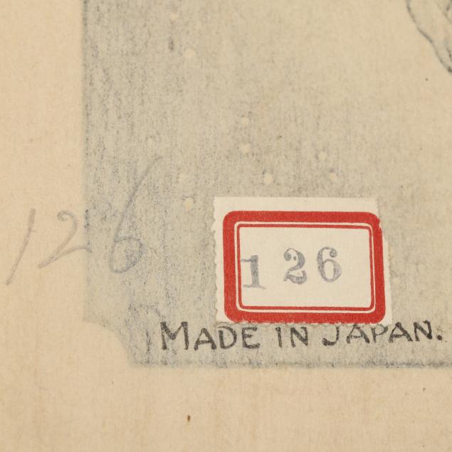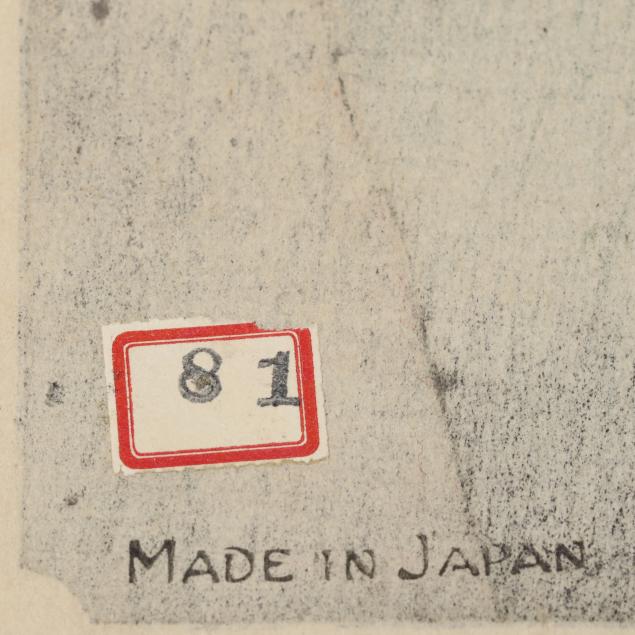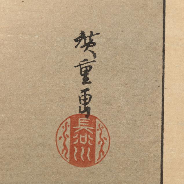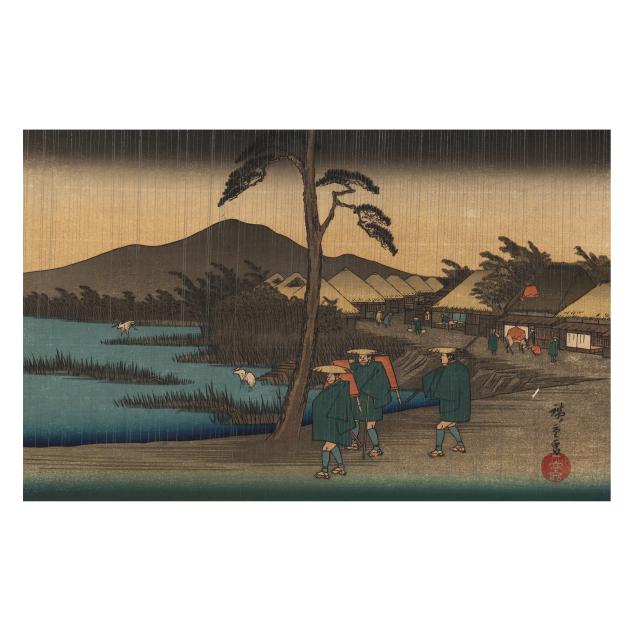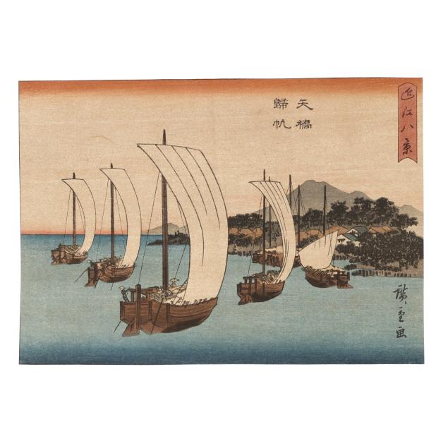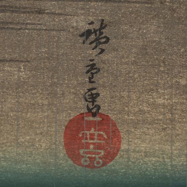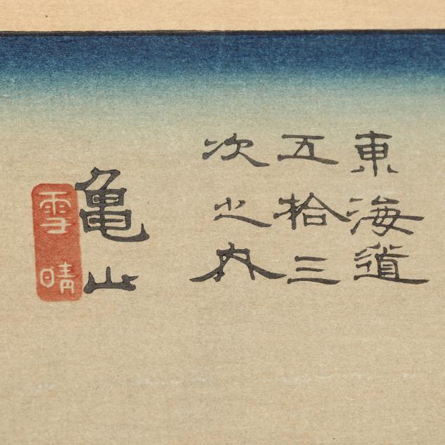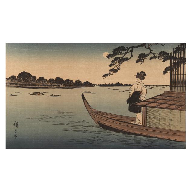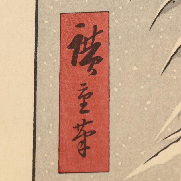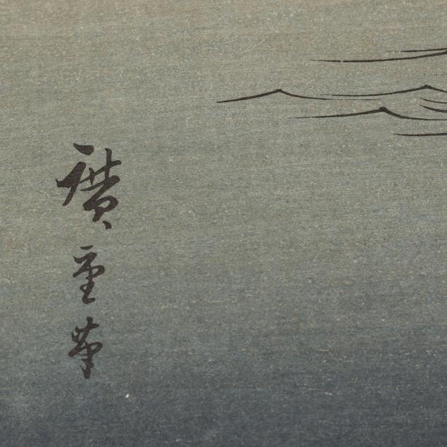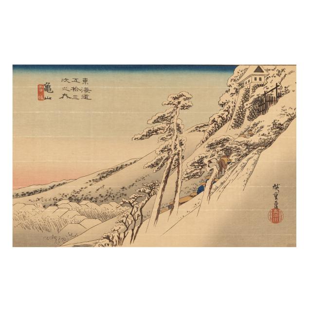 Kameyama, Snow Landscape from the 1833-34 series "The Fifty-three Stations of the Tokaido," and a reproduction print by Utagawa Hiroshige II of a lady on a boat at night, additionally two small works on paper are offered in this group, one is a woodblock print and one a card showing a detail from a woodblock print, all items are presented loose.