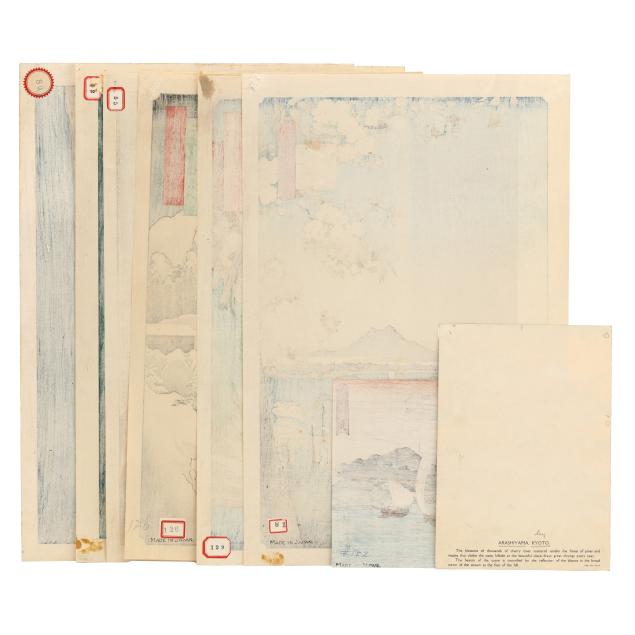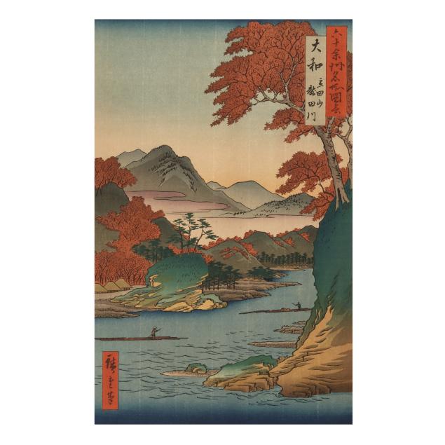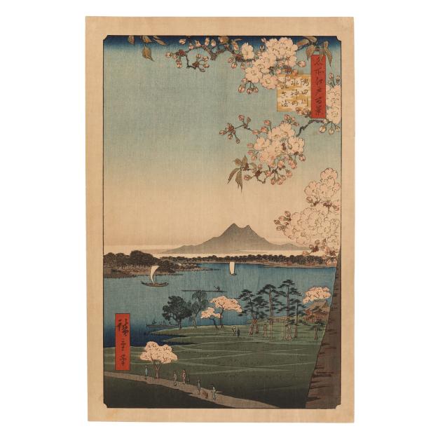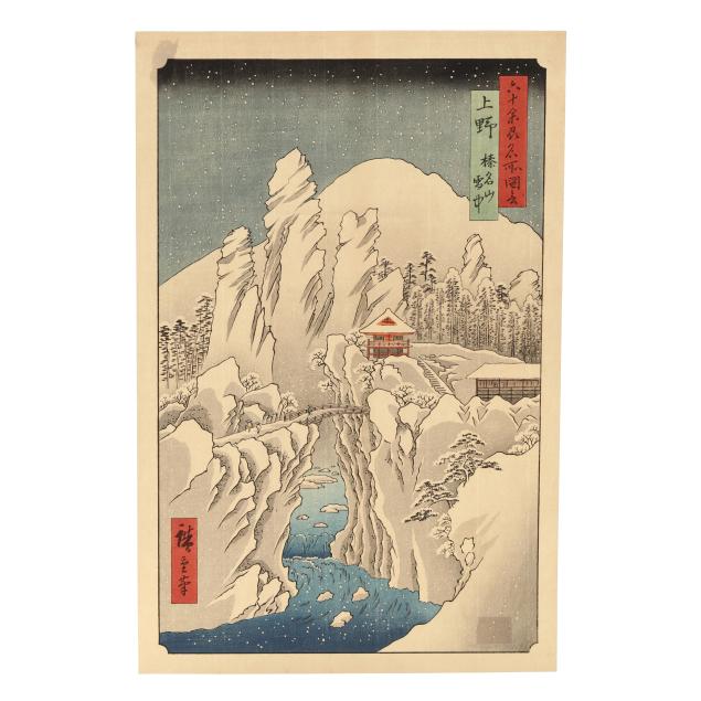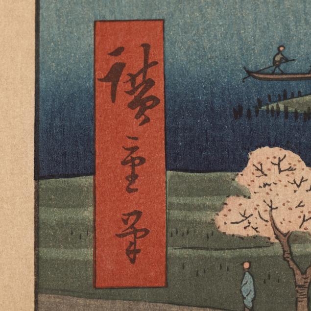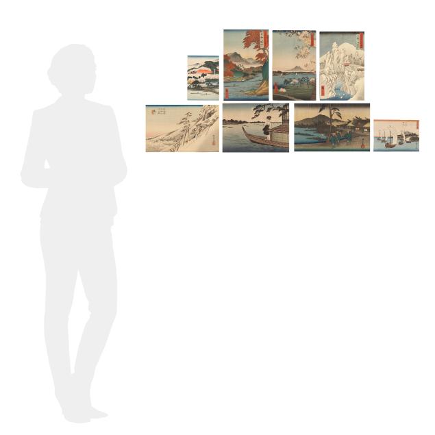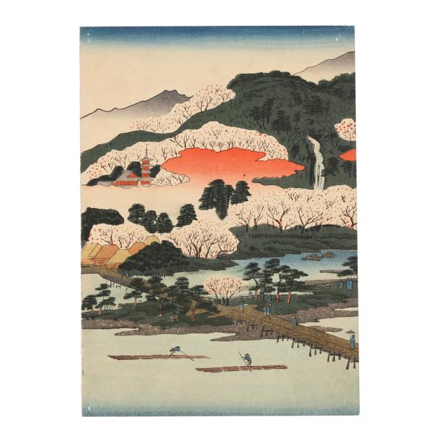 Mid 20th century, includes vintage reproduction prints from some of Hiroshige's famous series: to include a print from "Famous Places in the Sixty-odd Provinces," a print of cherry blossoms from the 1830-32 series "One Hundred Famous Views of Edo," two prints from the 1830s series "The Sixty-nine Stations of the Kisokaido," a print of
