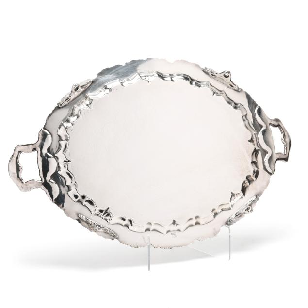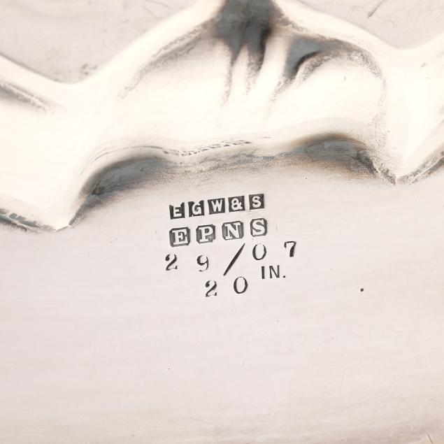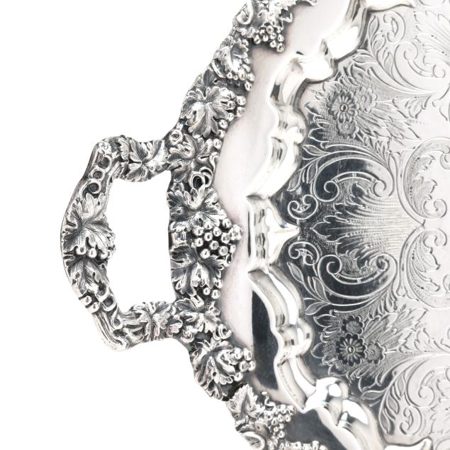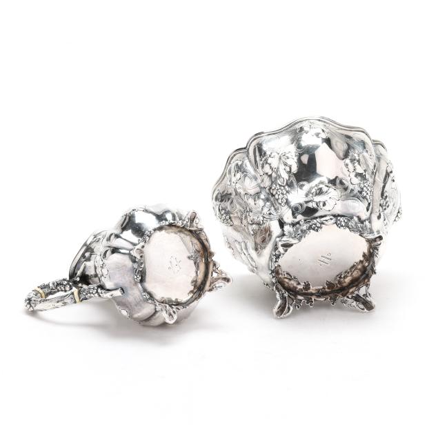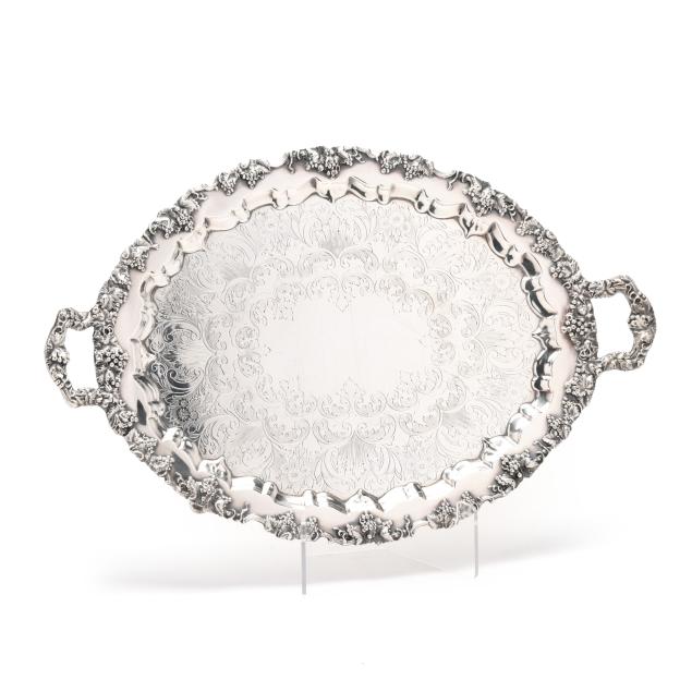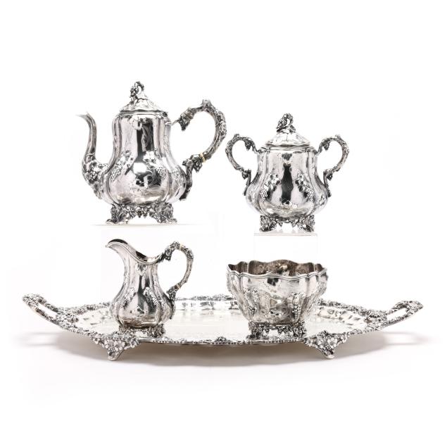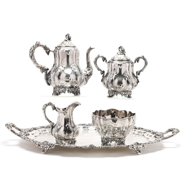 New York, circa 1830s-1850s, stamped "W. Forbes / New York" with pseudo hallmarks of a crown and star; includes a teapot (9 3/4 in.), sugar bowl (8 in.), creamer, and waste bowl; the lobed forms featuring allover hand-chased grape and vine decoration with naturalistic feet and handles, paired with a uniform silver-plated waiter's tray by E. G. Webster & Son (16 1/4 x 25 1/2 in.), not monogrammed.