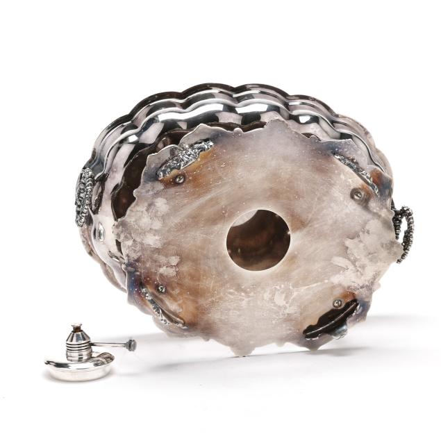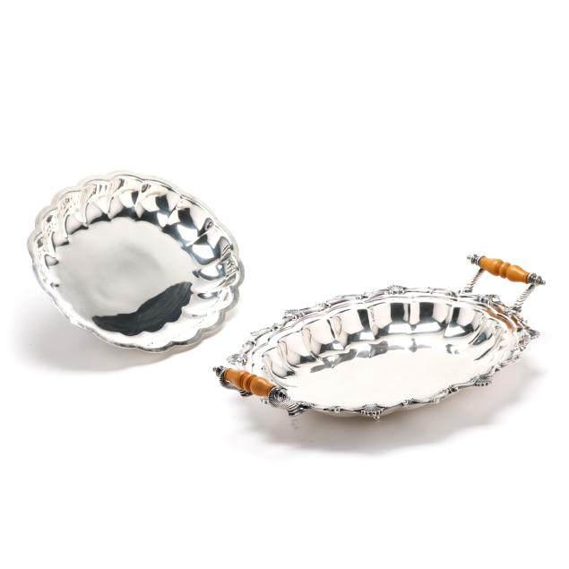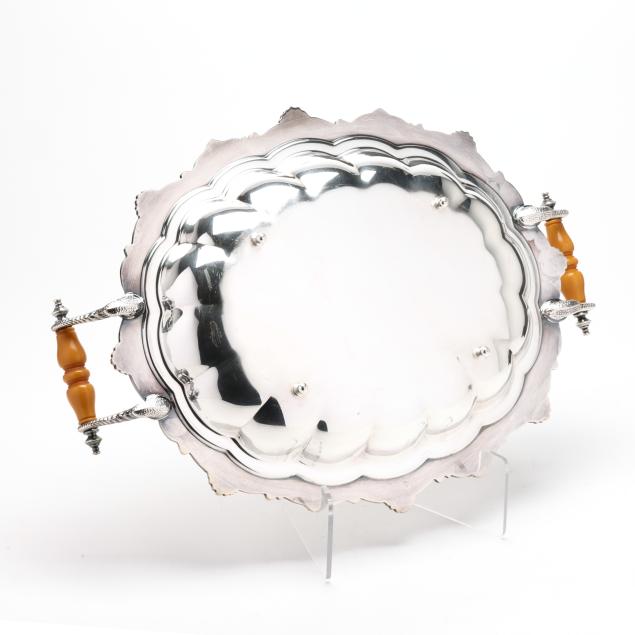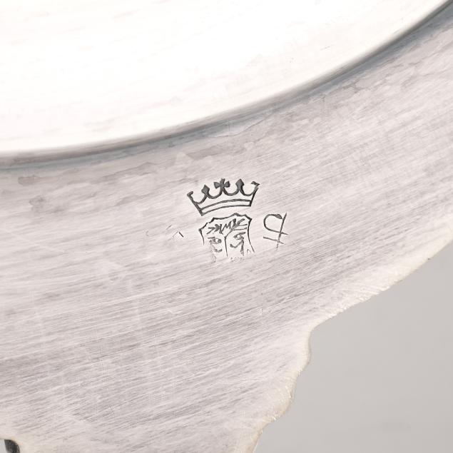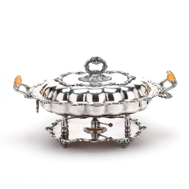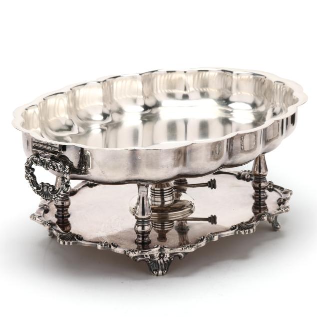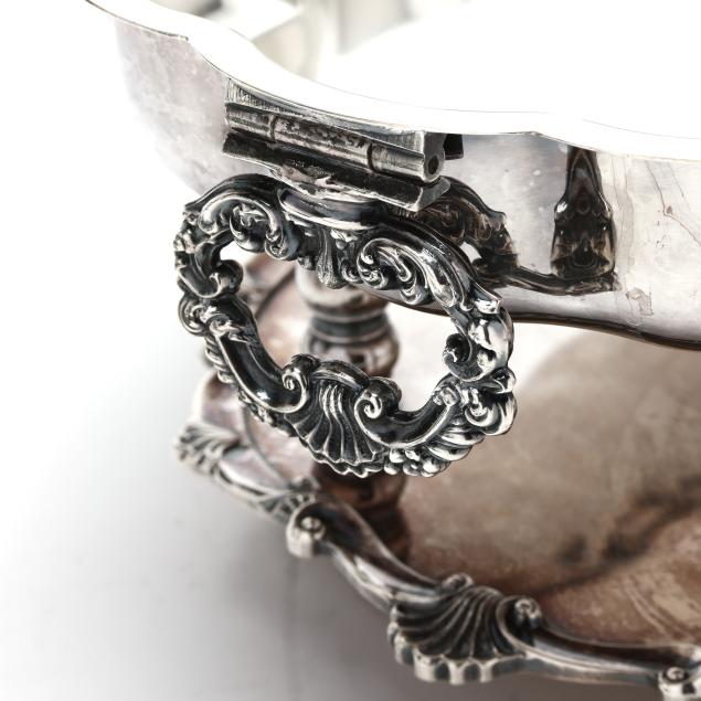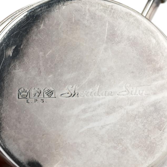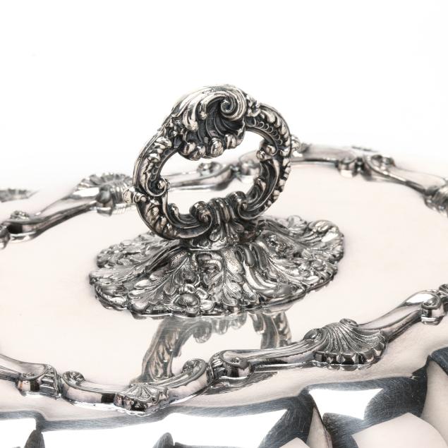 Mark of Sheridan Silver Company, circa mid-20th century, three-part form, featuring shell and foliate decoration, a c-scroll scalloped rim, turned wood and ring double handles, the stand raised on four cartouche feet, not monogrammed.