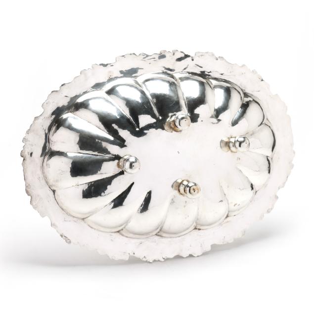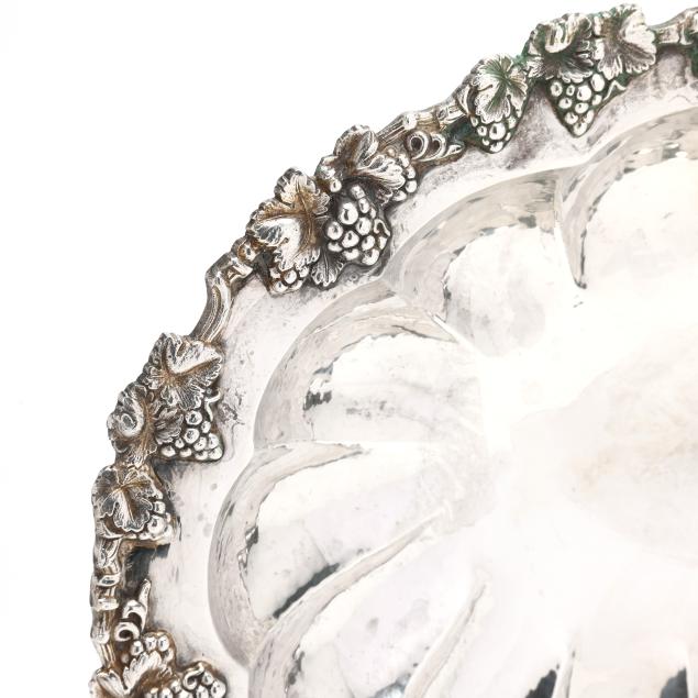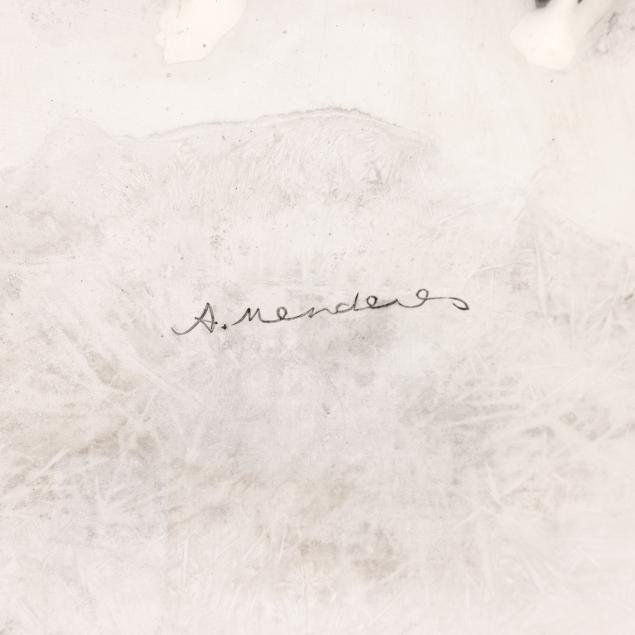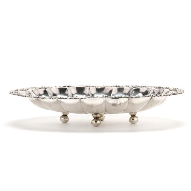 Mid 20th century, signed "A. Menderes" to the bowl, with a lobed bowl, grape and vine decoration to the rim, raised on four stacked ball feet, not monogrammed.