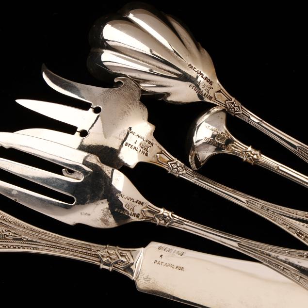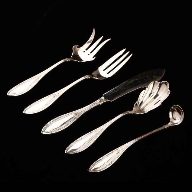 Designed by Charles Osborne in 1874, set including a flat handle master butter knife (7 1/4 in.), chipped beef fork (6 in.), old style pickle fork (6 1/4 in.), condiment ladle, and sugar spoon (6 in.). All without monograms, presented in period Kentucky retailer case with blue silk lining, marked "C. P. Barnes & Bro. / 224 Main St. / Louisville, KY."