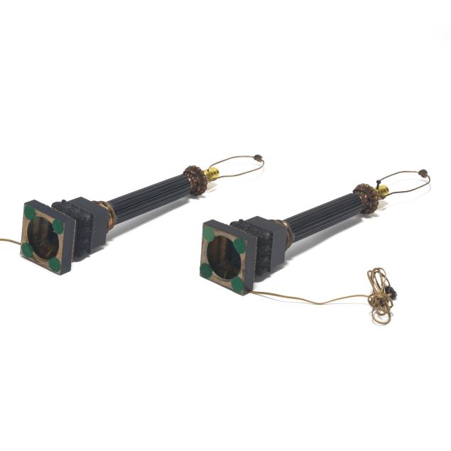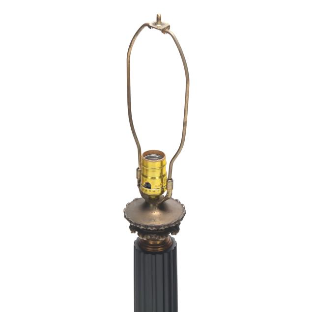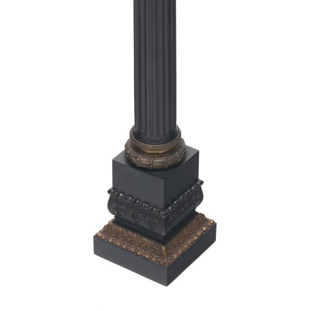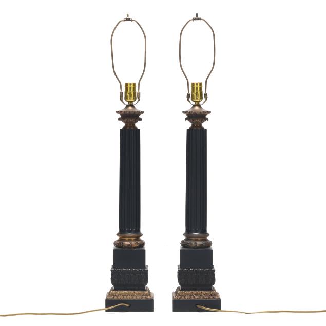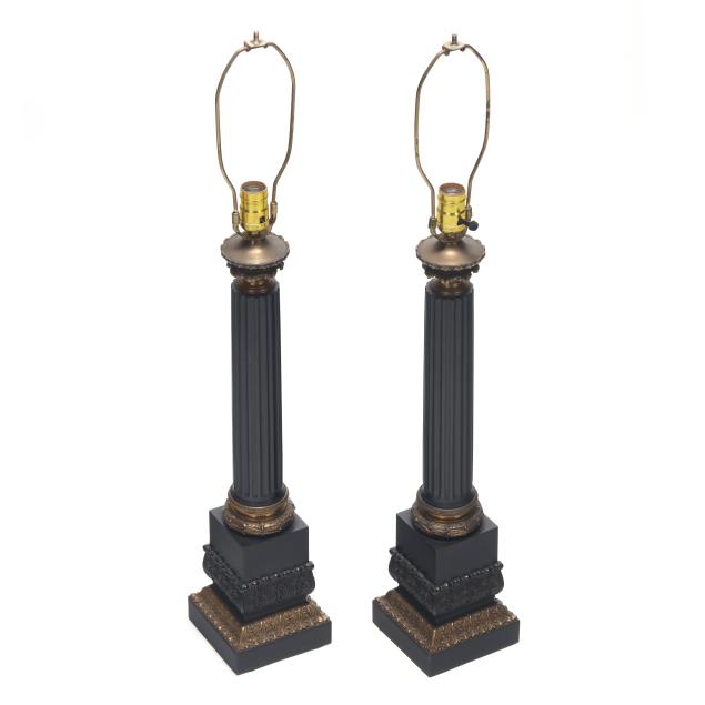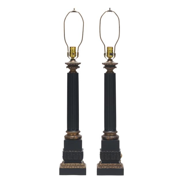 20th century, metal with applied ebonized and gilt finish, single socket forms cast as fluted columnar forms over a stepped plinth, with acanthus and laurel decoration, unmarked. Together with pair of matching pleated shades.