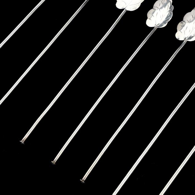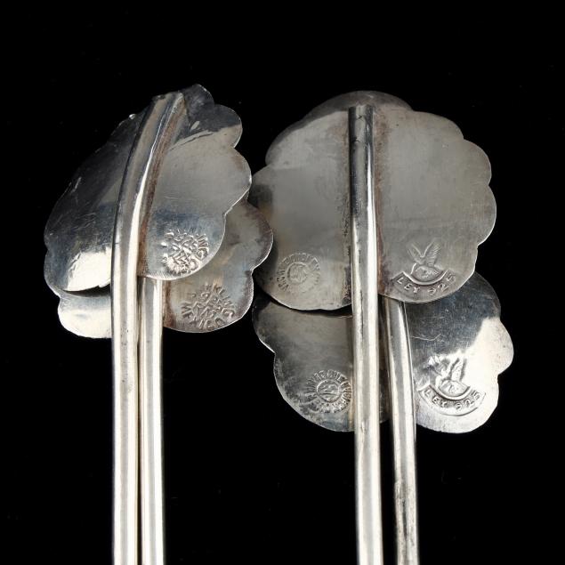 Mark of Cuernavaca, stamped with an eagle and "Ley 925", each with a scalloped leaf form bowl and straw handle, not monogrammed.