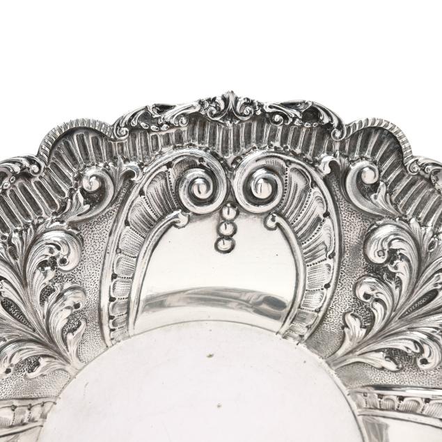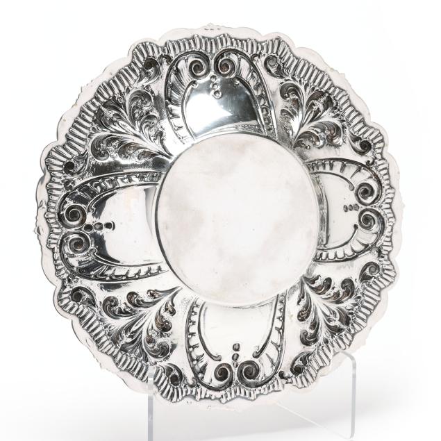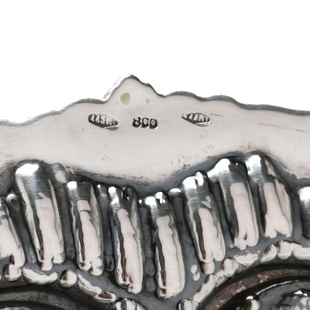 .800 silver, circa 1934-1944, featuring an ornate flange with scrolled and foliate motifs on a stippled ground, and a fluted rim. Not monogrammed.