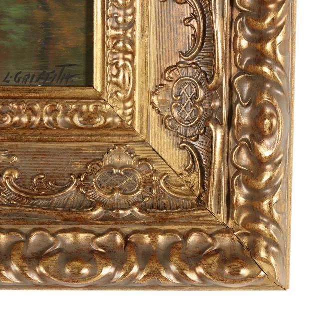 Oil on board, signed at lower right, retaining label to verso, presented in a later gilt frame.