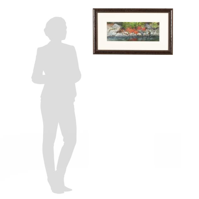 Watercolor and gouache on paper, signed at lower right, retaining artist label to verso, matted and framed under UV glass.