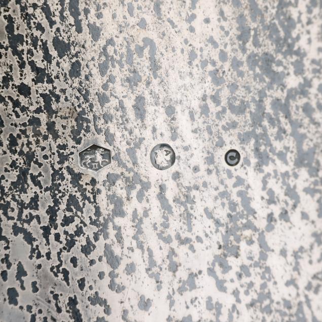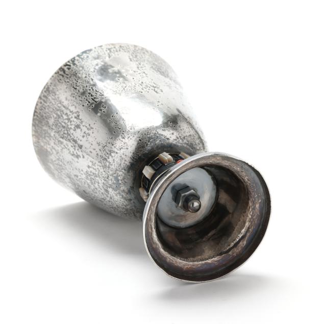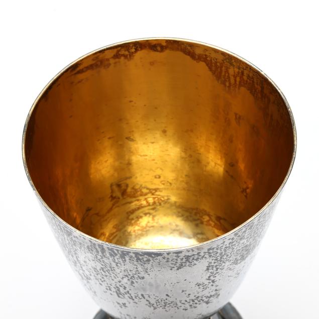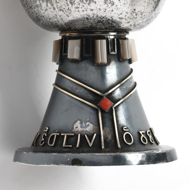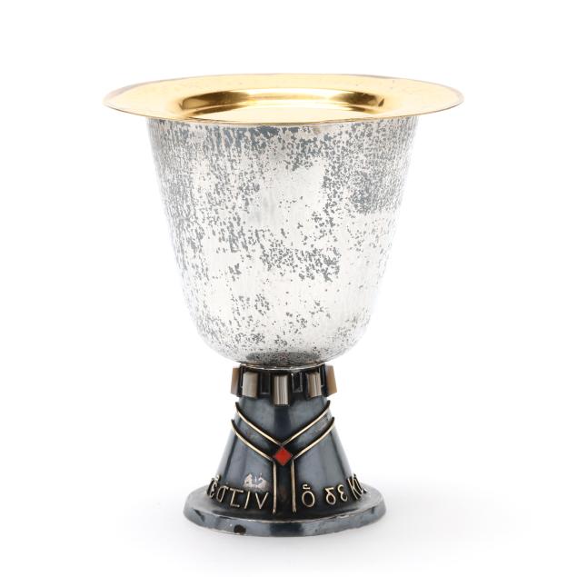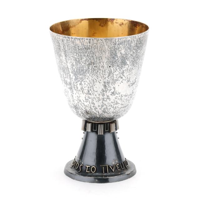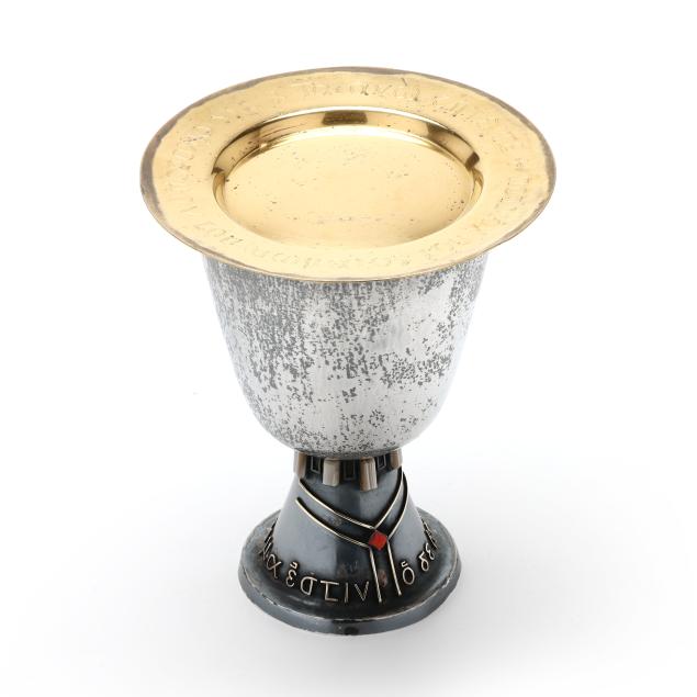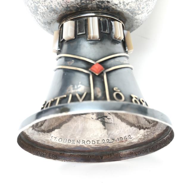 Amsterdam, circa 1962, .833 silver, custom design mounted with agate and coral, featuring a stylized cross, gold wash to the interior and patent surface, and applied and engraved lettering in Greek "The Holy Spirit" to the chalice base and "For the Blood and Body of Christ", "The Above Are True"; to the patent. The underside of the chalice engraved in Dutch "St Oudenrode 22-7-1962" / Vooor de Eredienstin de Afrikaanse Kerkgeschonken aan Frans Verhagen S. M. A Dooe Oudiers Broers en Zusters" or "For the Solemnity of the African Church donated to Frans Verhagen S. M. A by Oudier's Brothers and Sisters".