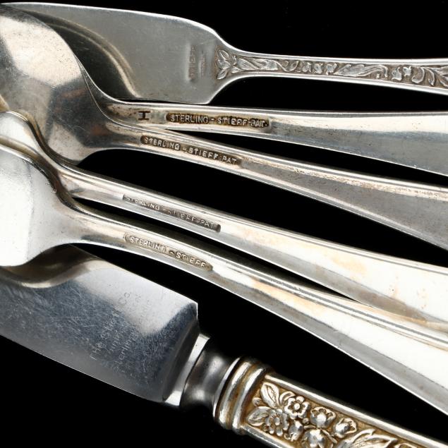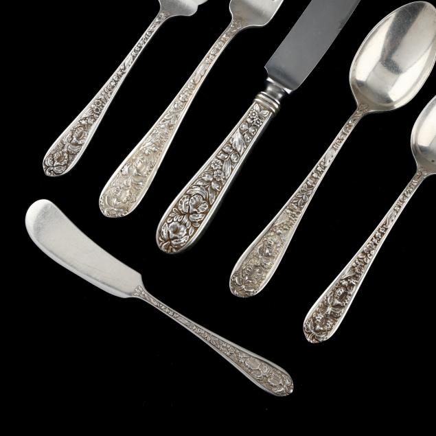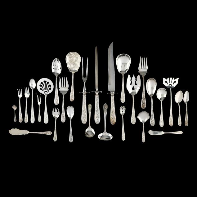 (135) pieces to include: (8) knives (8 3/4 in.); (13) forks (7 in.); (16) salad forks (6 in.); (21) tea spoons (5 7/8 in.); (3) oval bowl place spoons; (7) round bowl soup spoons; (8) fruit spoons; (8) ice cream spoons; (8) iced tea spoons; (11) seafood forks; (9) butter spreaders; a large serving fork; (2) cold meat serving forks; a casserole spoon; a berry spoon; a serving spoon; a pierced tablespoon; a tomato server; a bacon fork; a gravy ladle; a cream ladle; a sugar spoon; a bon bon spoon; a jelly server; a master butter knife; a pickle fork; (2) lemon forks; an olive spoon; a salt spoon; and a (3) piece carving set; all monogrammed.