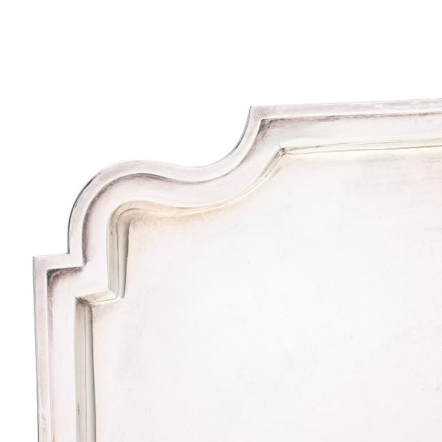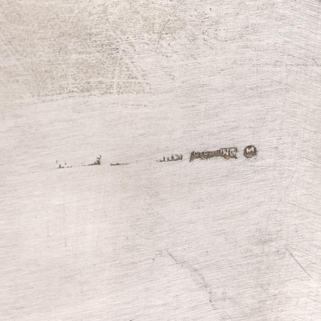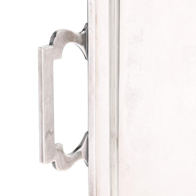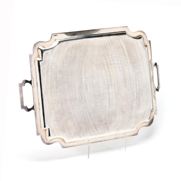 Partially obscured marks including "Sterling", the shaped rectangular tray with uniform double handles, not monogrammed.