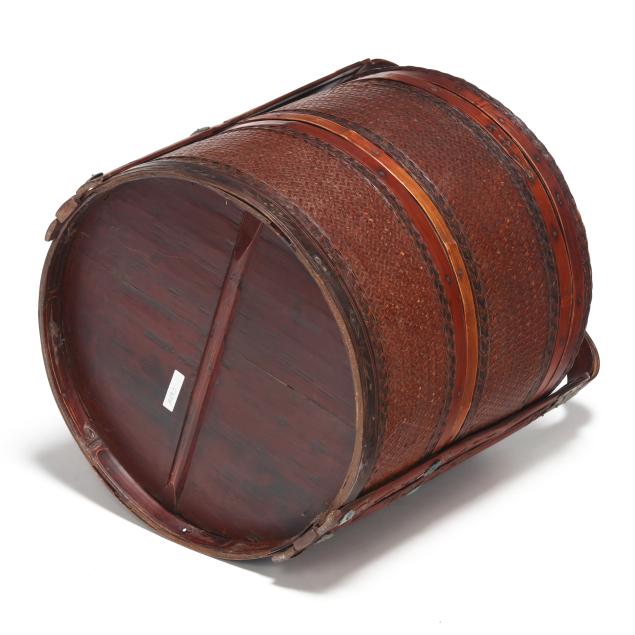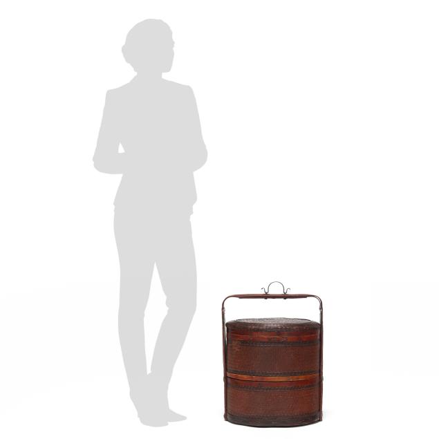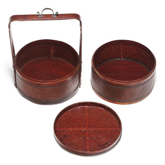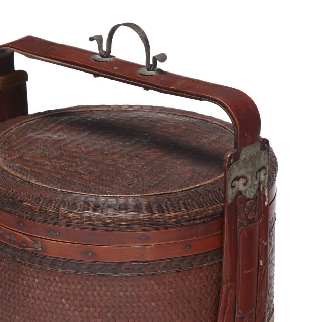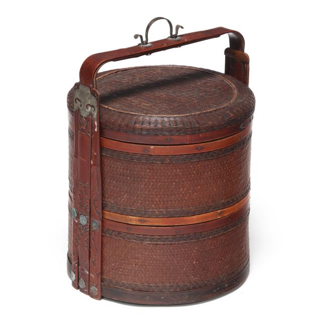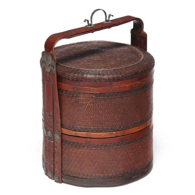 Early 20th century, two tiered woven basket with cover, a carrying handle wraps around the basket secured to the sides of the lowest box, the handle is carved with bats and flowers and features decorative metal embellished hardware, paper label to the underside.