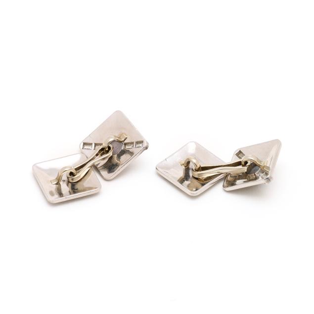 The double sided square cufflinks, one side set to the center with a round cut star sapphire and diagonally channel set baguette cut diamonds weighing approximately .50 total carat (F-G color, VS1-VS2 clarity), the other side monogrammed SB, connected by a figure eight link, XRF testing 90% platinum