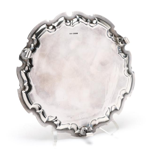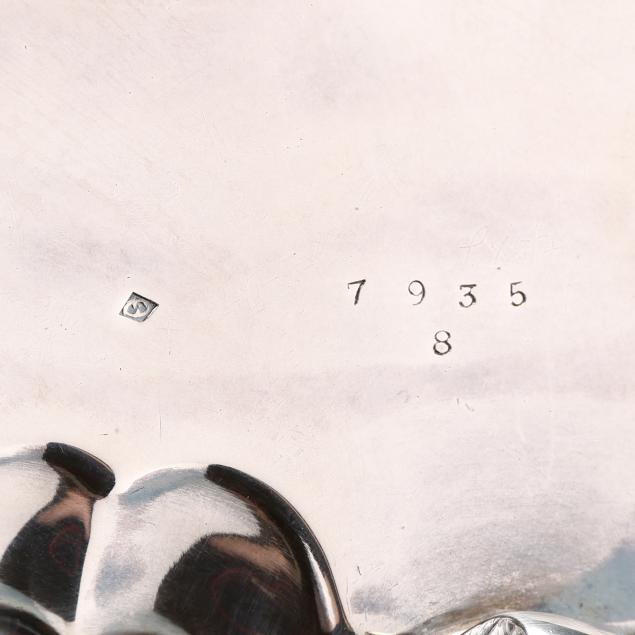 Sheffield (1896), pattern number 7935, featuring a shaped rim, raised on three scrolled feet, not monogrammed.