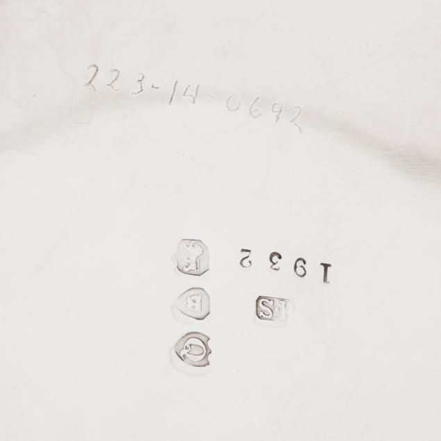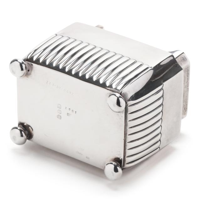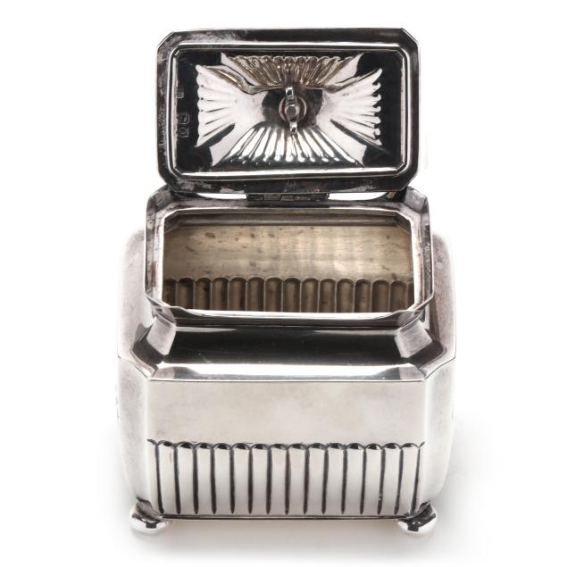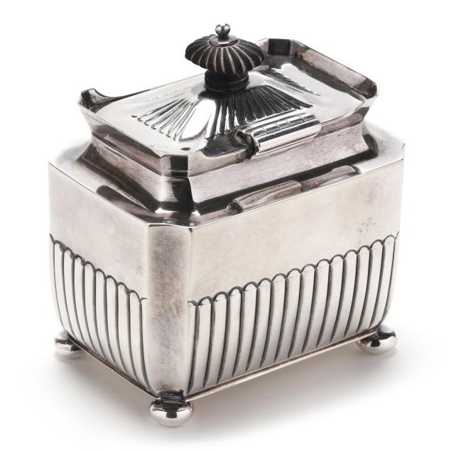 London (1891), pattern number 1932, the form with a fluted lower register and uniform lid topped with an ebony finial, raised on flattened ball feet.