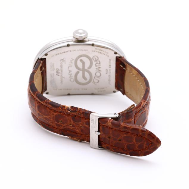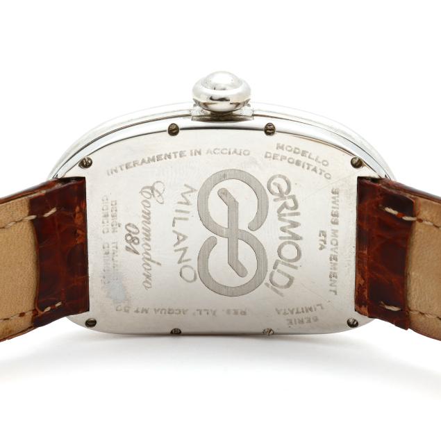 Automatic, ETA 2824-2, the curved oval stainless steel case with polished bezel, the signed silver dial with oversized luminescent Arabic numeral hour markers, luminescent leaf hands, and date window at 6:00 hour, the brown textured leather strap with stainless steel buckle, the caseback signed and marked Design Italiano / Giorgio Grimoldi.