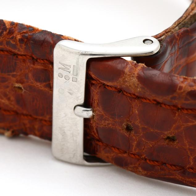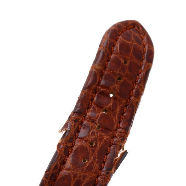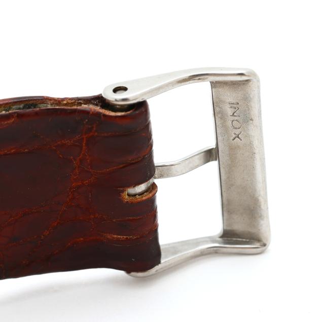 Wear to leather strap; small scratch to crystal at 6:00 hour; running at time of examination. Please see Terms and Conditions of Sale: Clocks and Watches.