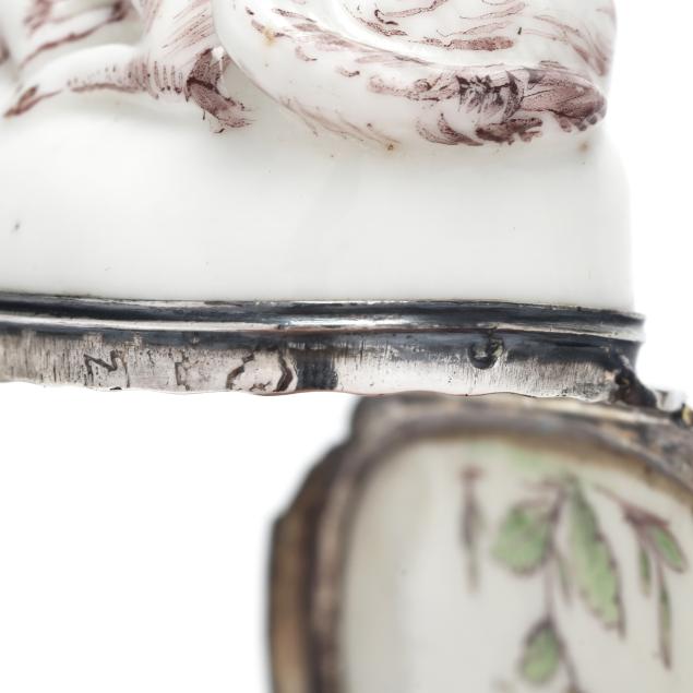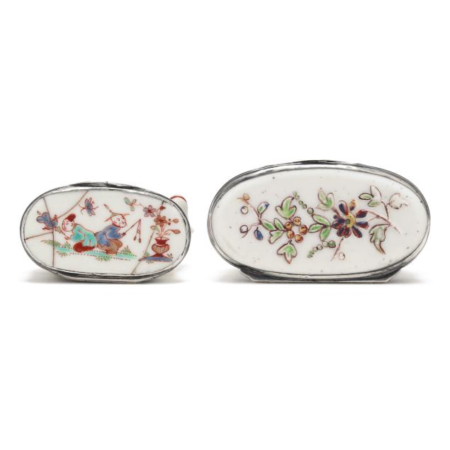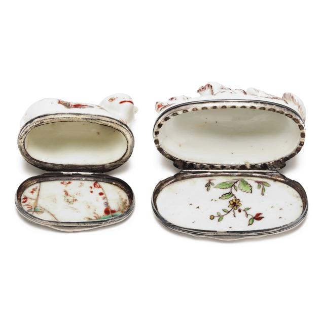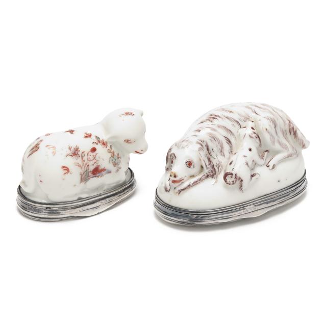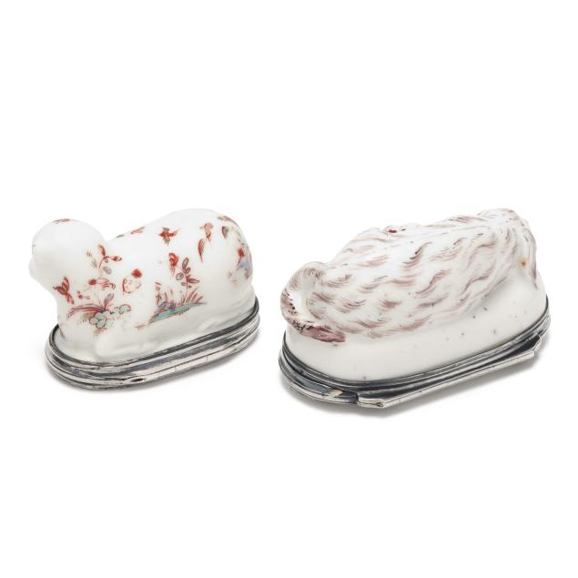 French, mid 18th century, the silver mounts with partially rubbed hallmarks, one of the boxes has two marks appearing to be the Parisian Mark of the Maison Commune circa 1752, and the small discharge mark of Paris, circa 1744-1750; the other with an obscured crown mark; hand-painted soft paste porcelain, mounted with silver bezel clasp retaining period marks, the first of a recumbent lamb, attributed to St. Cloud, painted in the Kakiemon style with various figural vignettes with floral and fauna, mounted silver mounted base clasp (2 1/2 in.); the second of a recumbent spaniel and her pup, the underside panel decorated with painted floral spring motifs (3 1/8 in.).