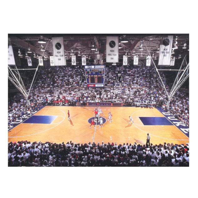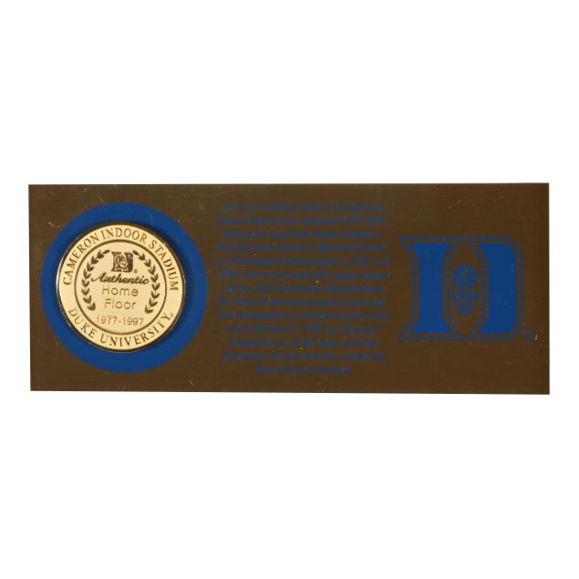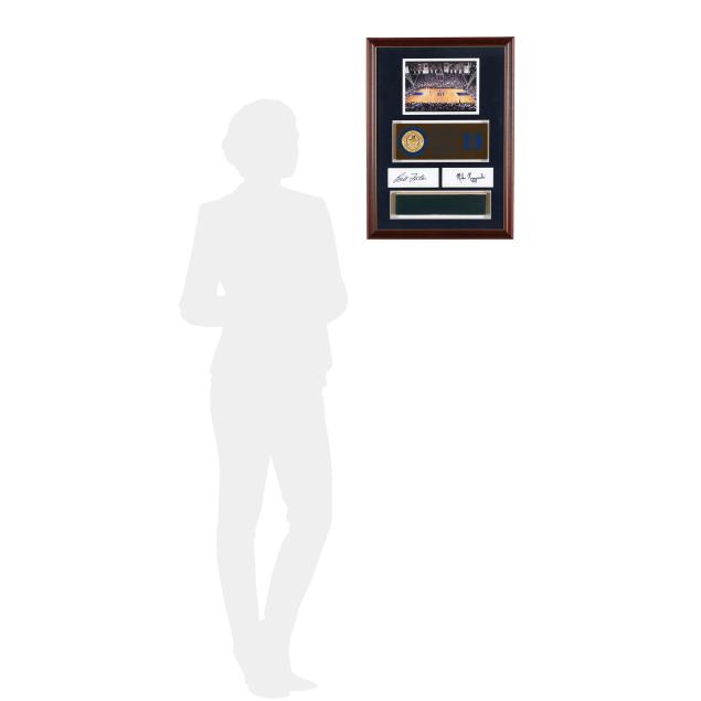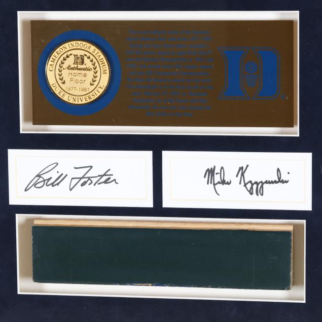 "This is an authentic piece of the Cameron / Indoor Stadium floor used from 1977-1997. / During this time, Duke teams compiled a / 243-50 record, played in eight Final Fours [registered trademark symbol] / won the National Championship in 1991 and / 1992, and earned seven ACC regular season / and five ACC Tournament Championships. / Ten Duke All-Americans played on this court. / This photograph is of the final tip-off on this / court, February 27, 1997, vs. Maryland. / Autographs are of Bill Foster and Mike / Krzyzewski, the two men who coached the / Blue Devils on this floor."