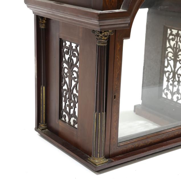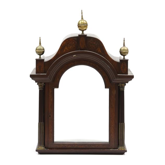 Some minor surface scratches and marks to the veneers; a few edge nicks to the corners; areas of rubbing and tarnish to gilt and silvered elements; three brass column reeds detached but present; lunette with some paint loss; some loss to right rear bracket foot; some small areas of wood loss to interior front case door.