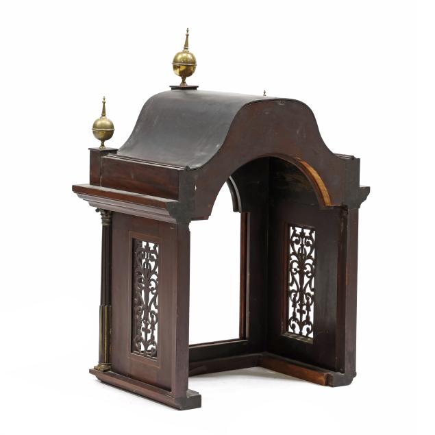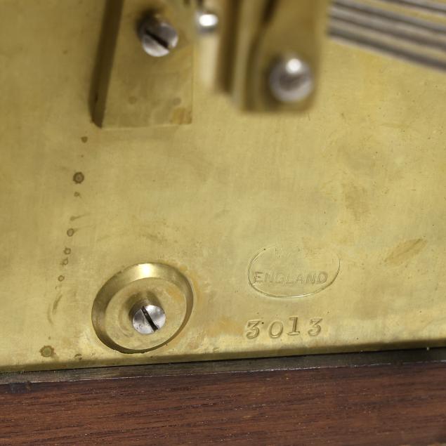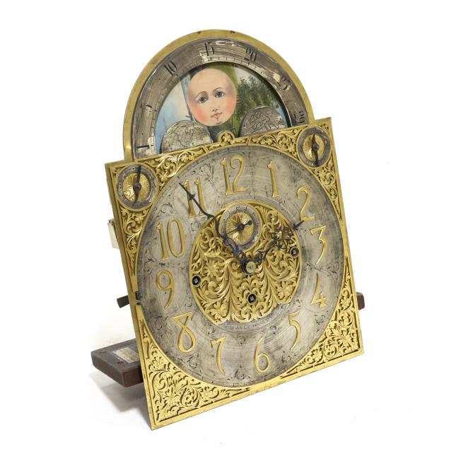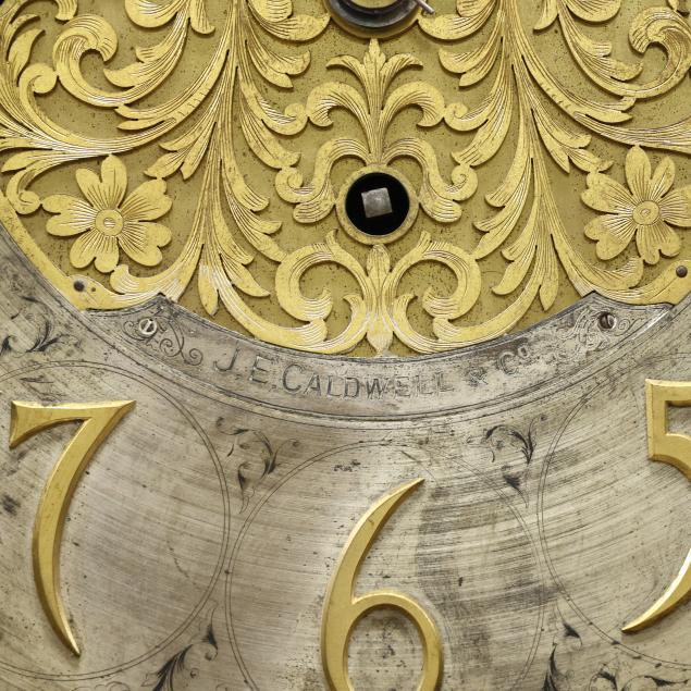 Late 19th century, tombstone gilt brass and silvered dial signed J.E. Caldwell & Co. with Arabic hour chapters, ornate chased floral and scroll spandrels, the center with subsidiary dial, upper left corner with silent and strike options, upper right corner with Whittington and Westminster chime options, beneath a hand-painted lunette with calendar and moon phases, operated by a (3) train brass musical movement striking on a rack of (8) bells, the reverse panel stamped "MADE IN ENGLAND" and numbered 3013, mounted with additional (5) arm gong strike, set within a Classical style mahogany case inlaid with urn and ribbon tied bell flower motifs, paterae and floral scroll and swag, the hood in rectangular case body with carved fully turned and fluted Corinthian columns with brass mounts, surmounted with (3) spired sphere brass finials over a cove molded base with bracket feet, includes pendulum, (3) weights and case key.