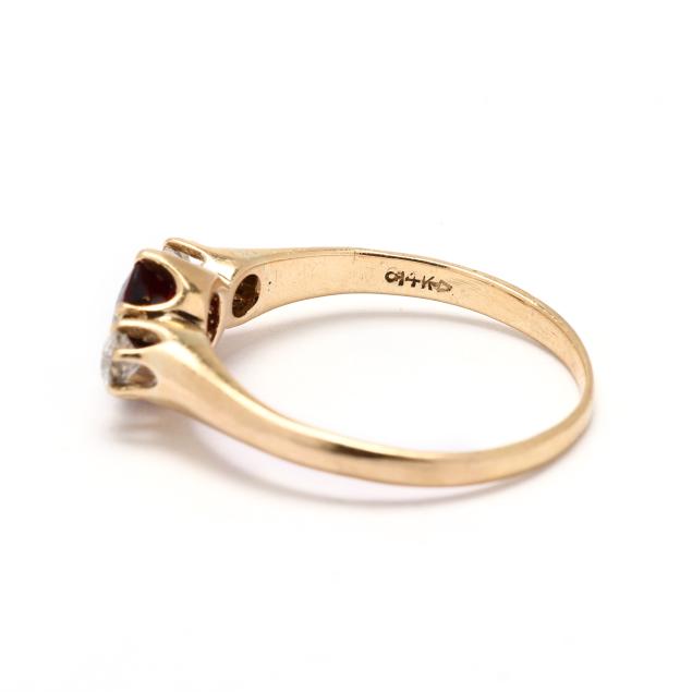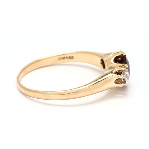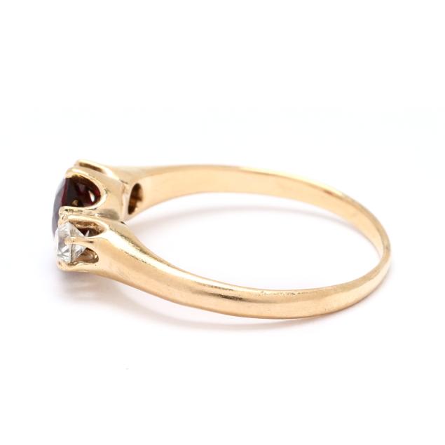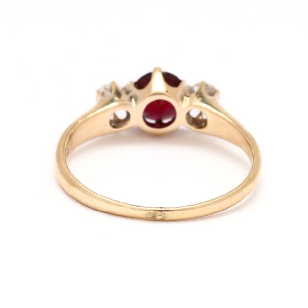 Centered on a round cut garnet (5.4mm) and set to the sides with old mine cut diamonds weighing approximately .25 total carat (I-J color, SI2-I1 clarity), stamped 14K and with a maker's mark.