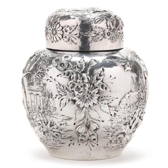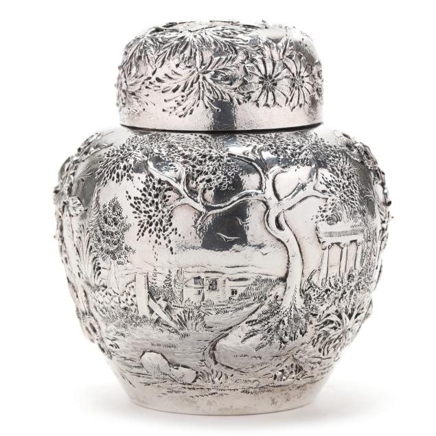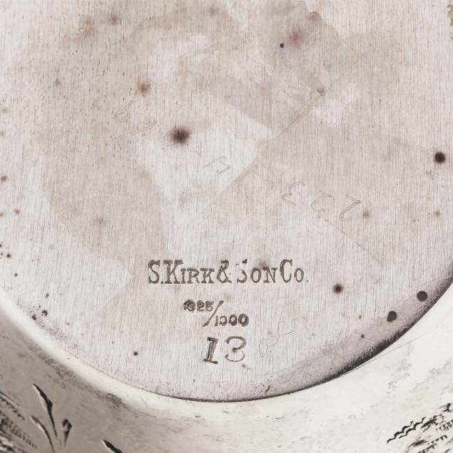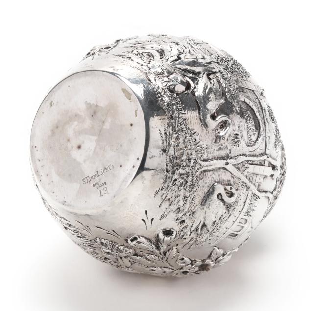 Circa 1896-1924, pattern number 13, featuring hand chased landscape with bridges, classical architecture, trees, birds, and flowers, not monogrammed.