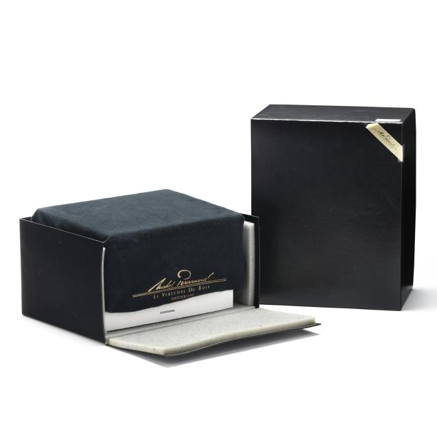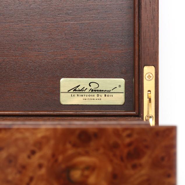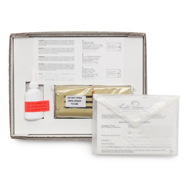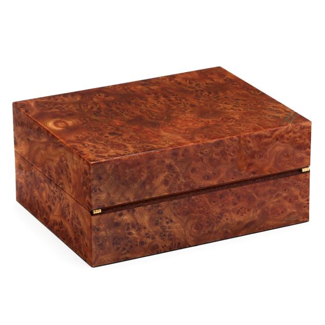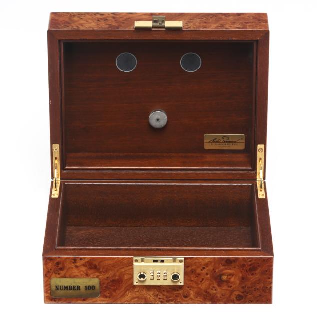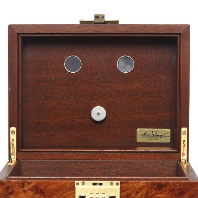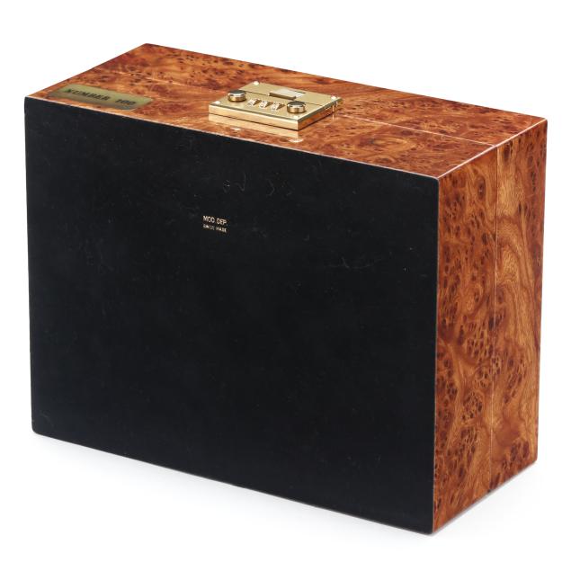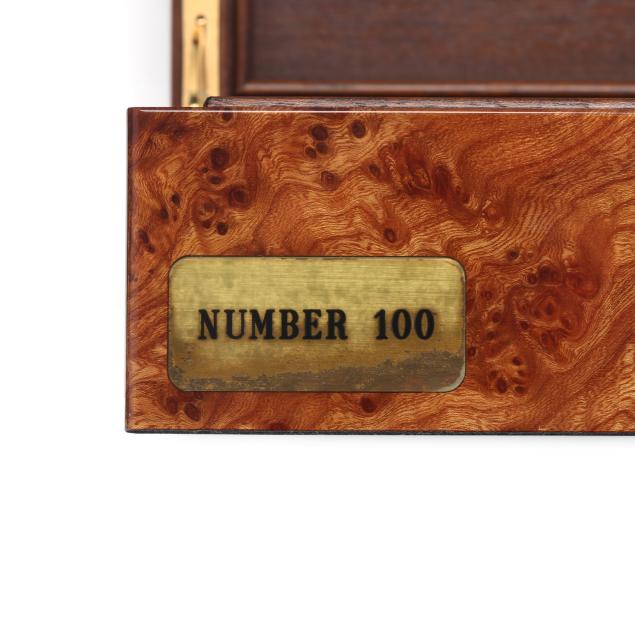 Switzerland, lacquered burlwood box with three-dial lock, labeled "NUMBER 100" to front, includes care instructions and unopened accessories.