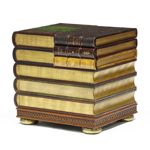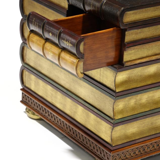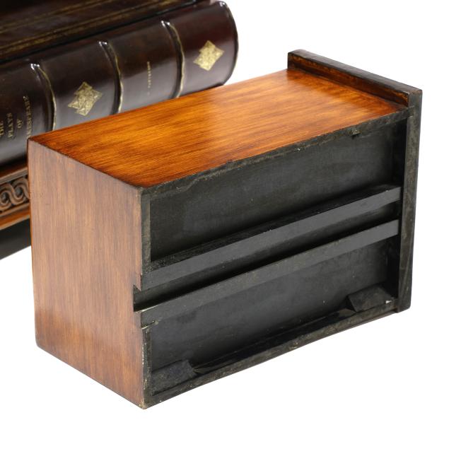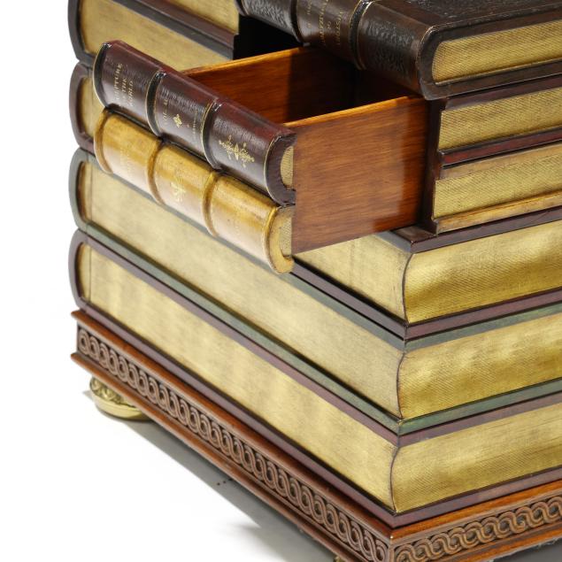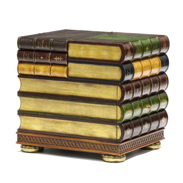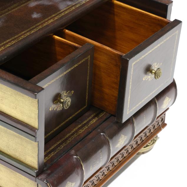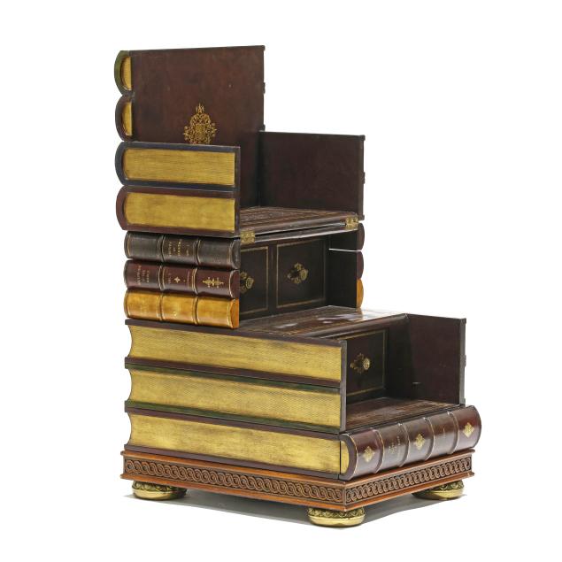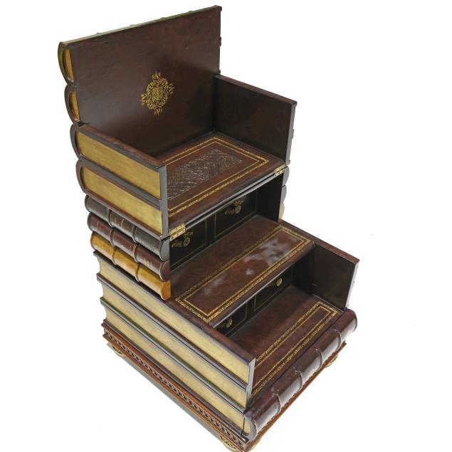 Late 20th century, embossed and gilt leather-wrapped mahogany case, hinged lid with step interior having two drawers and two faux drawers, over one faux book-spine lower drawer, the case sides with hidden drawers, gilt metal feet, labeled.