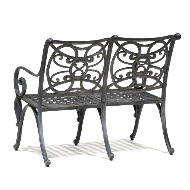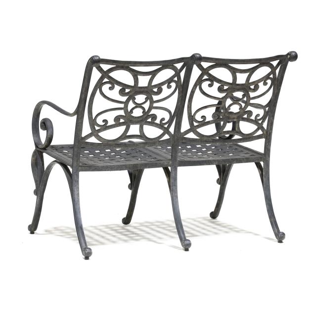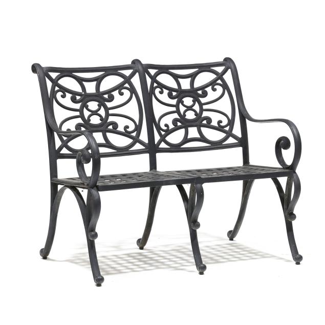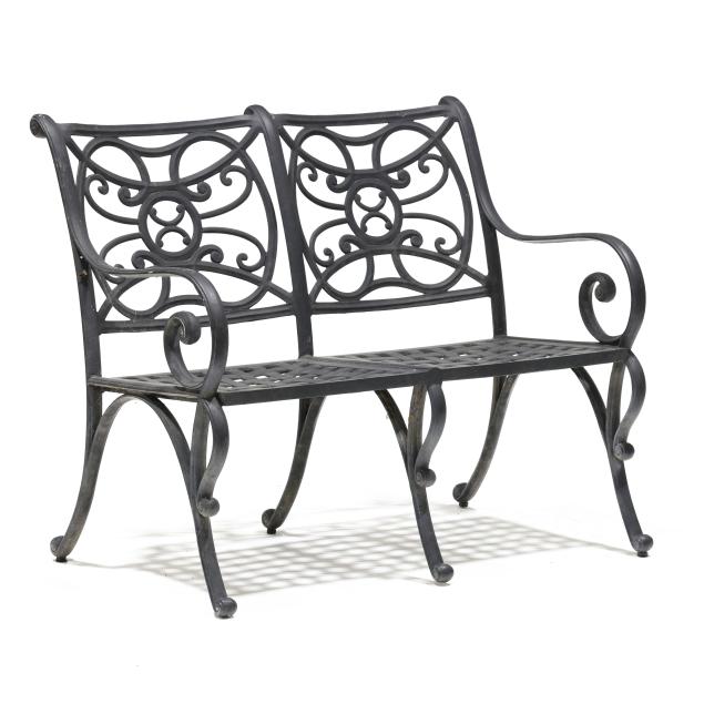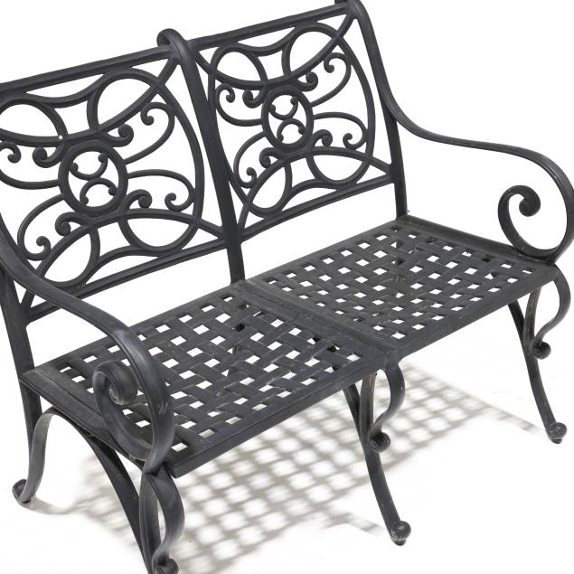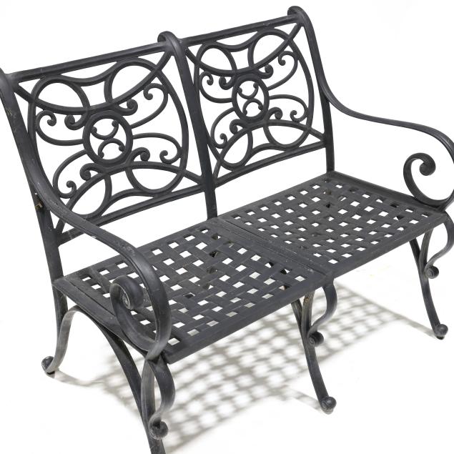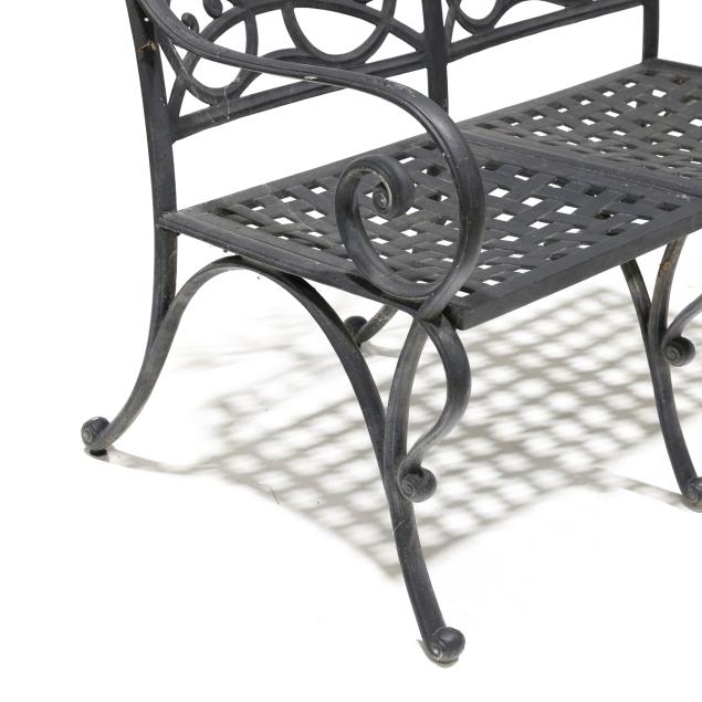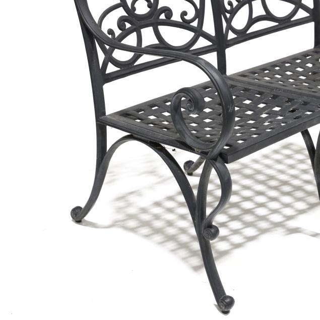 Late 20th century, black painted aluminum with open scrollwork back, lattice style seat, splayed legs, appears unmarked.