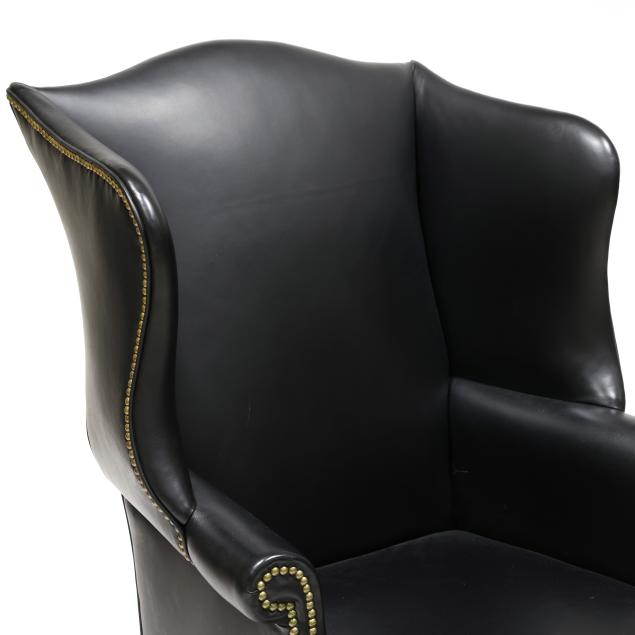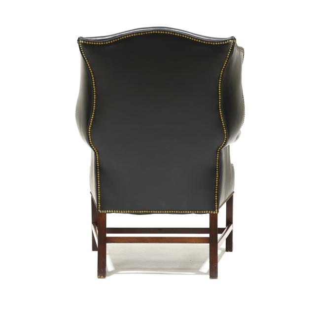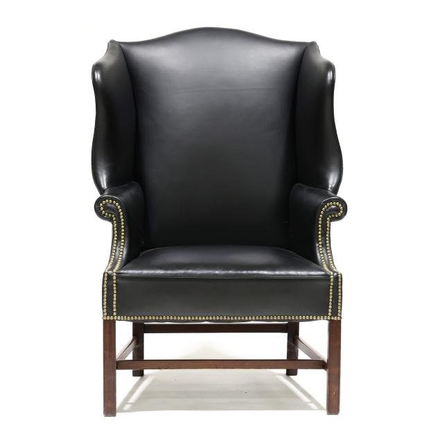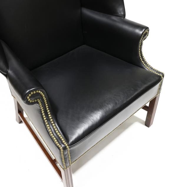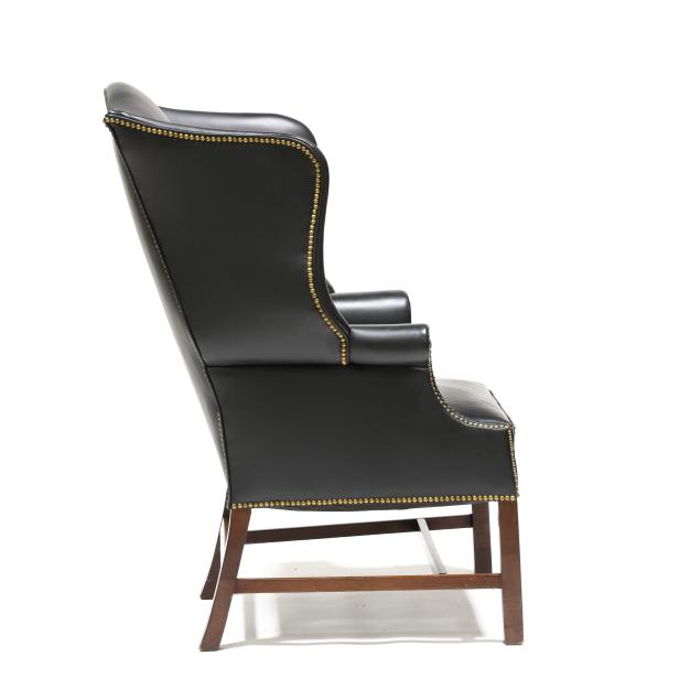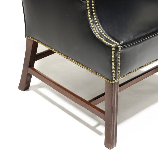 Early 20th century frame with later black leather upholstery and brass tack trim, straight molded front mahogany legs with stretcher base, unmarked.