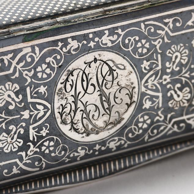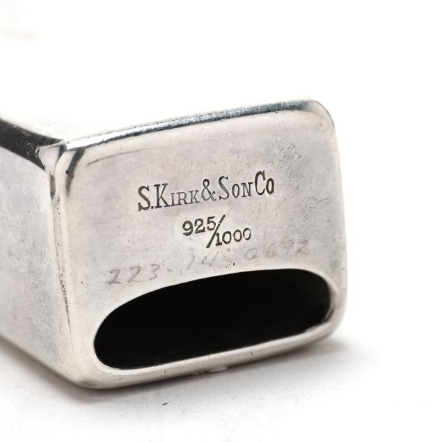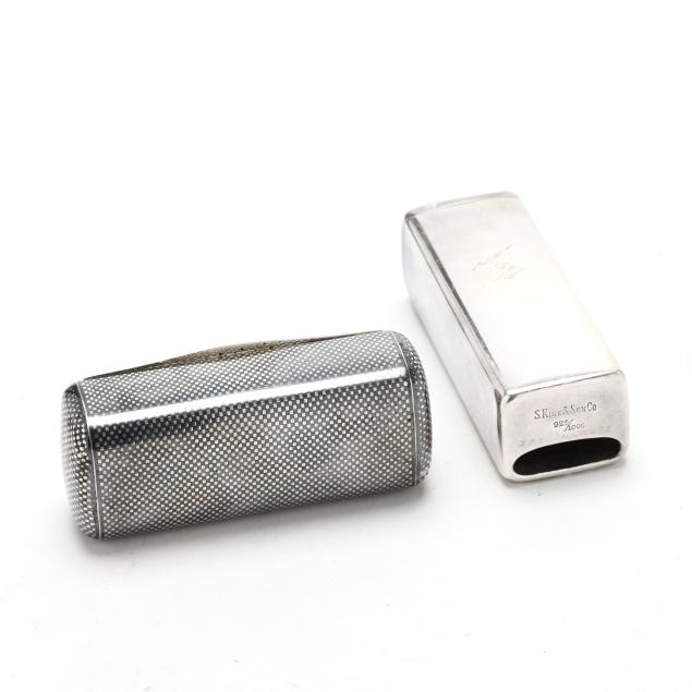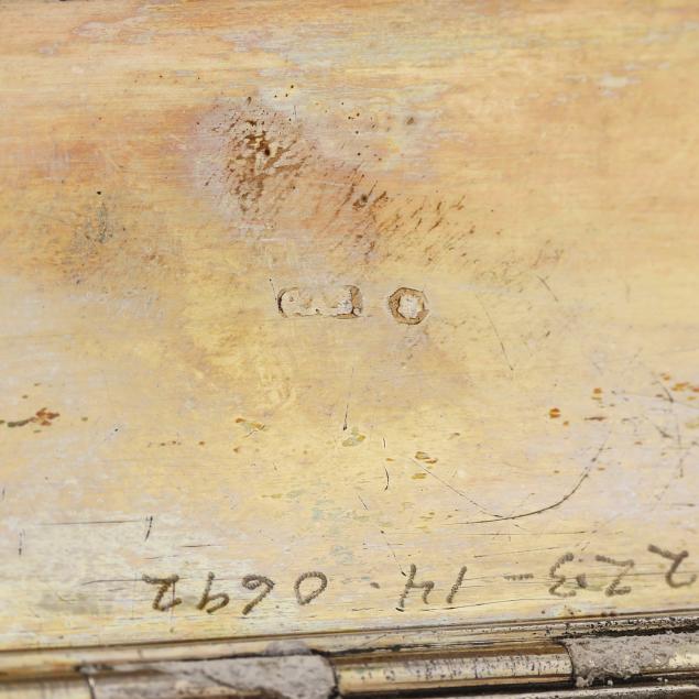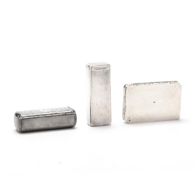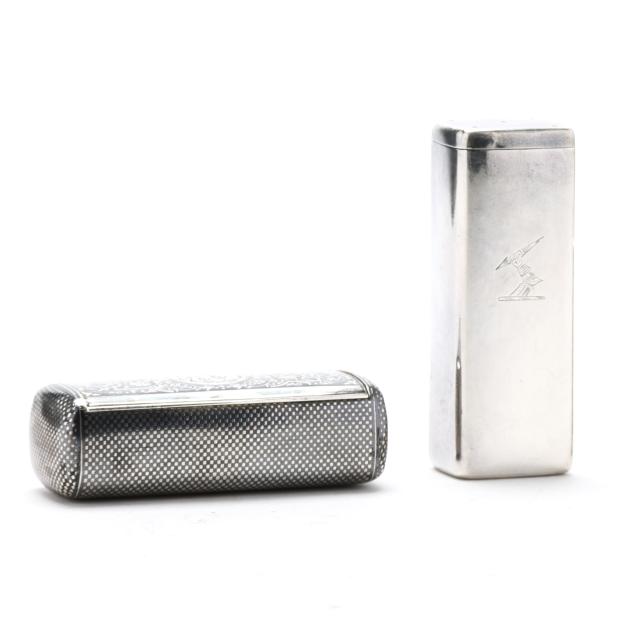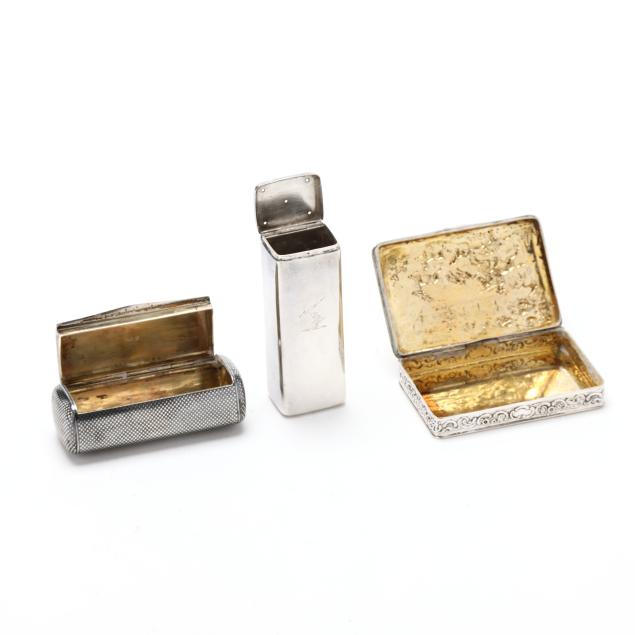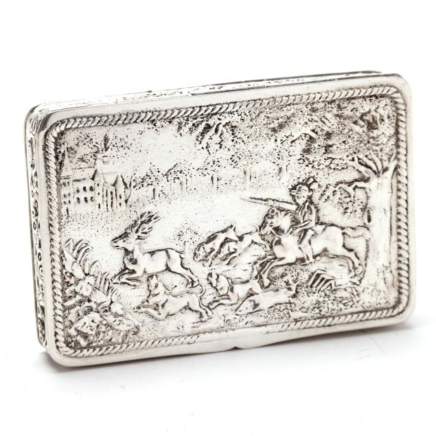 The first, an toothbrush cover, mark of S. Kirk & Son Co., with an armorial monogram; an Austria-Hungarian .900 silver box, circa 1872-1922, with Niello enamel to the exterior, gold wash interior, and bright cut monogram, with unidentified "G.A.S." maker's mark; and a continental .800 silver box with fox hunt scene to the lid and gold wash interior.
