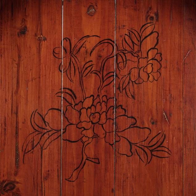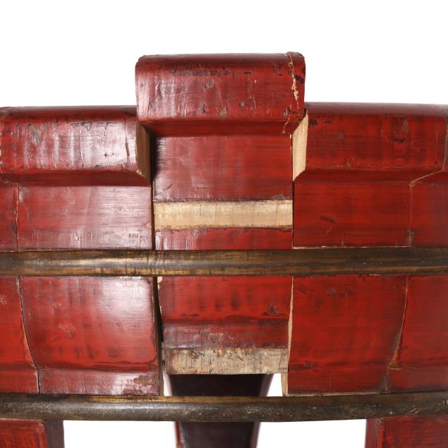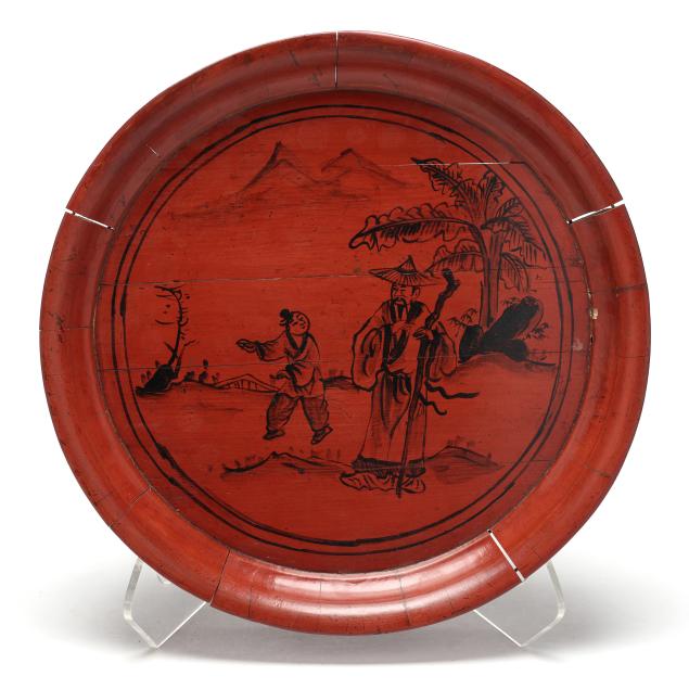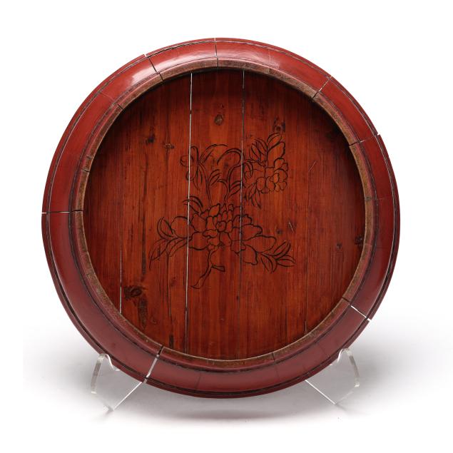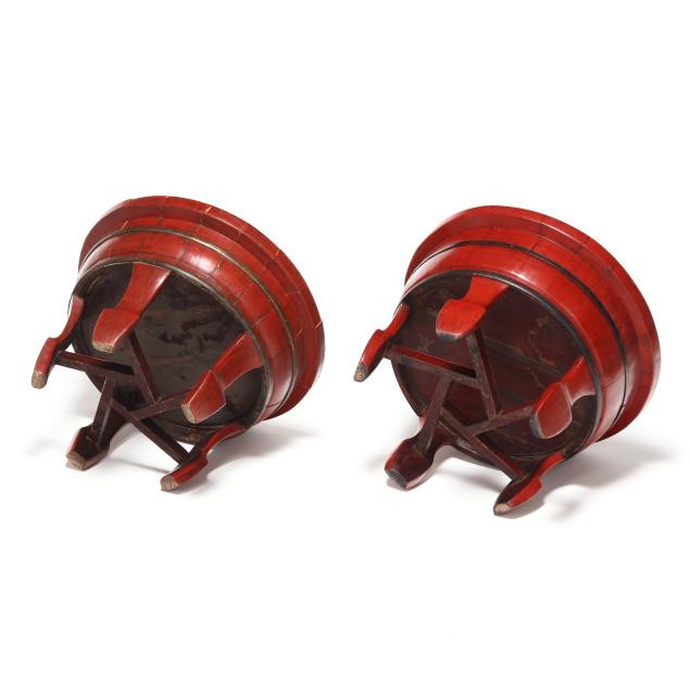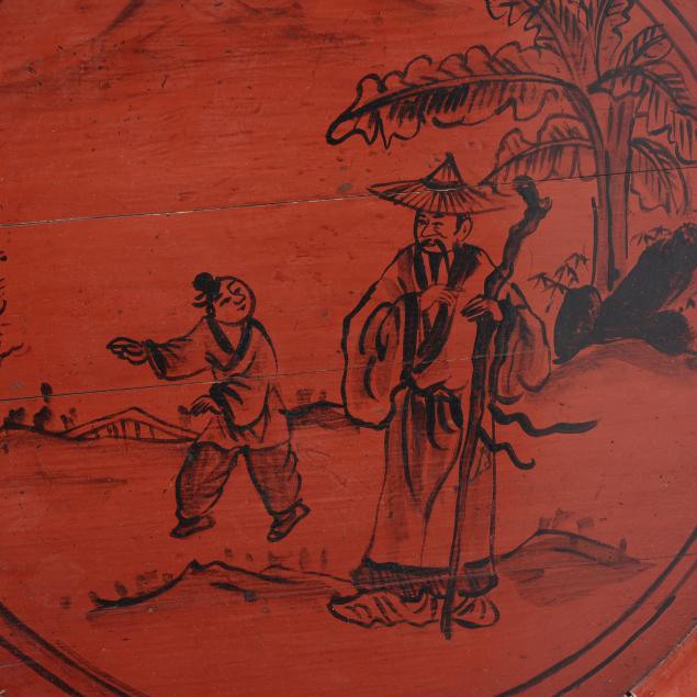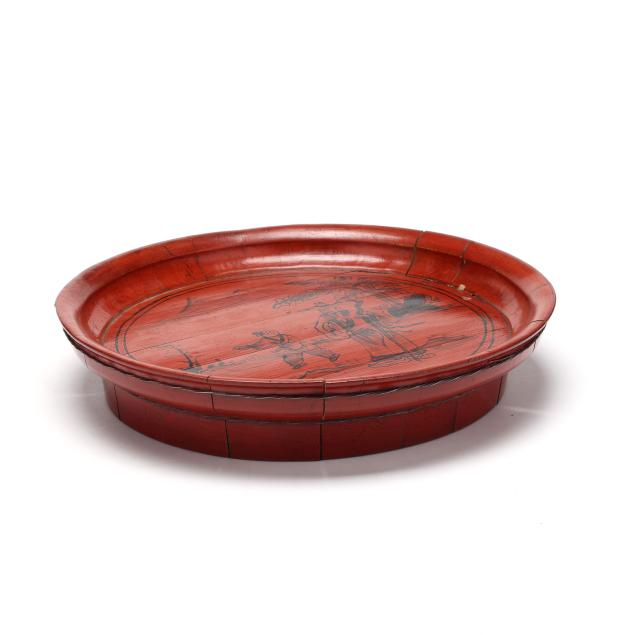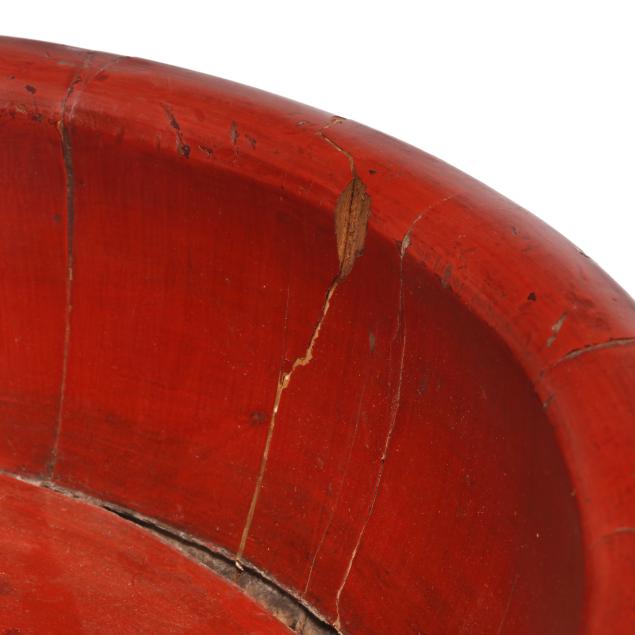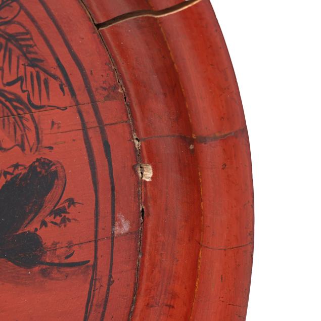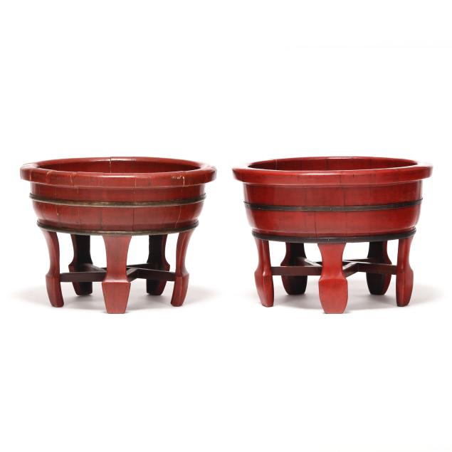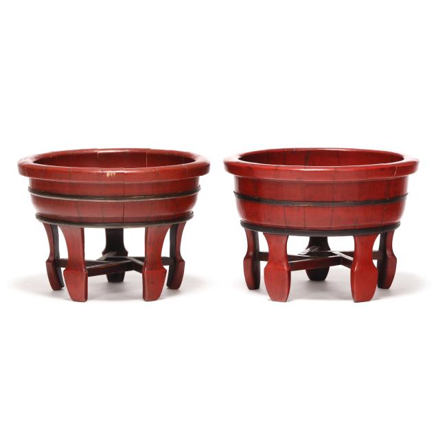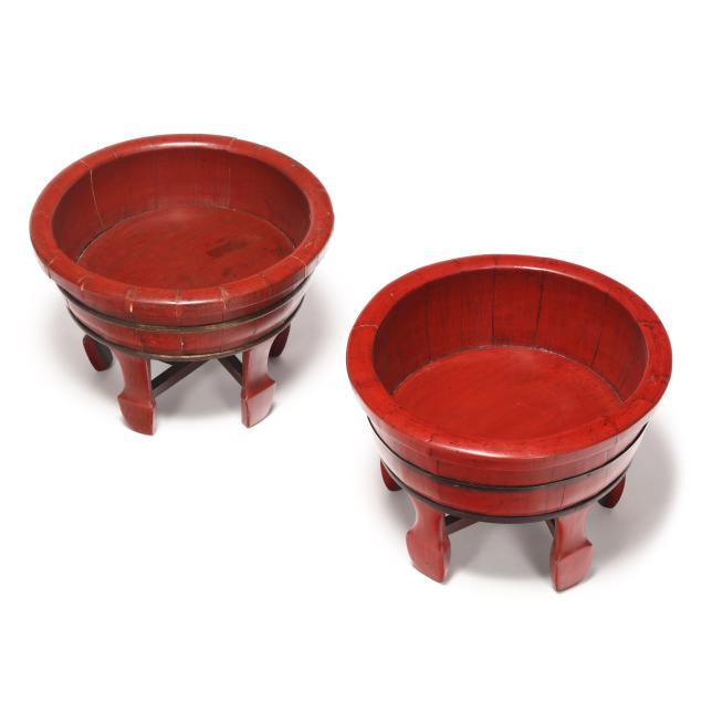 Includes a pair of red painted wooden circular baby bath basins raised on shaped legs, presented together with a painted red wood circular tray painted with a figural scene.