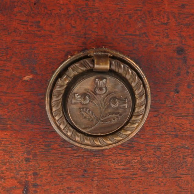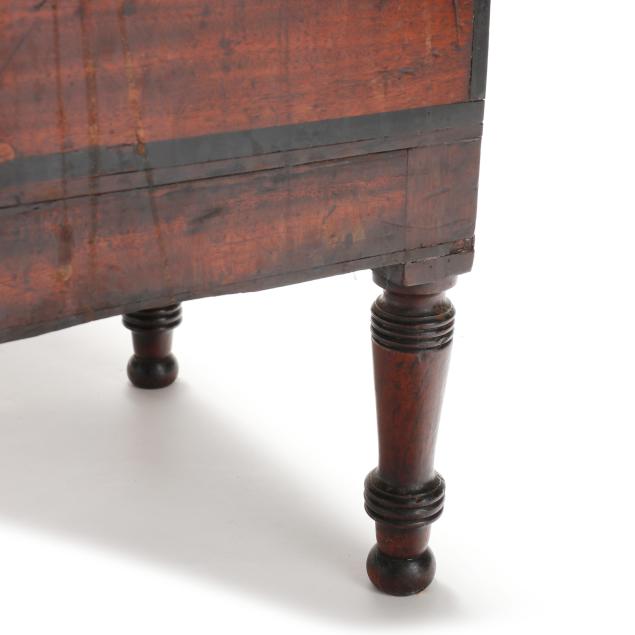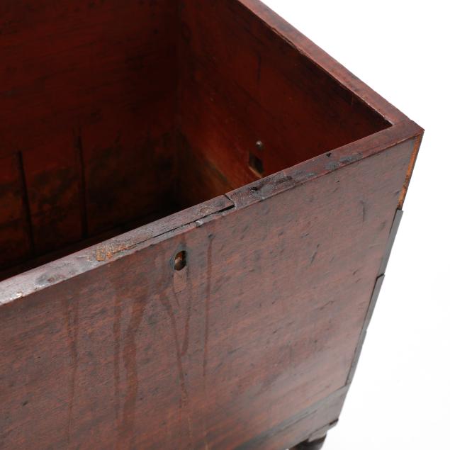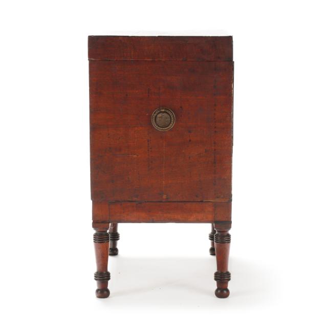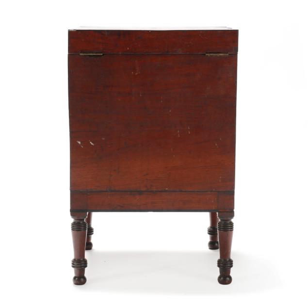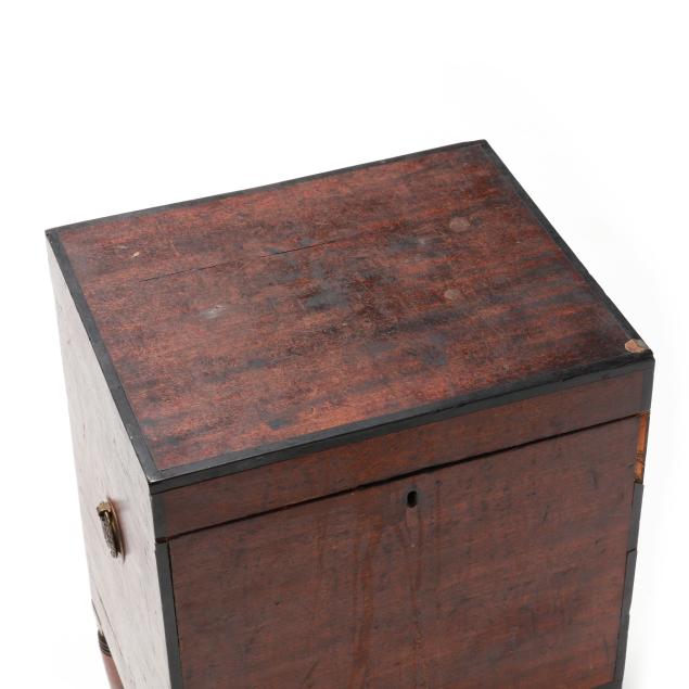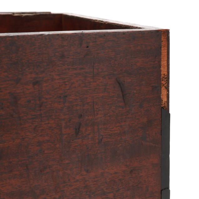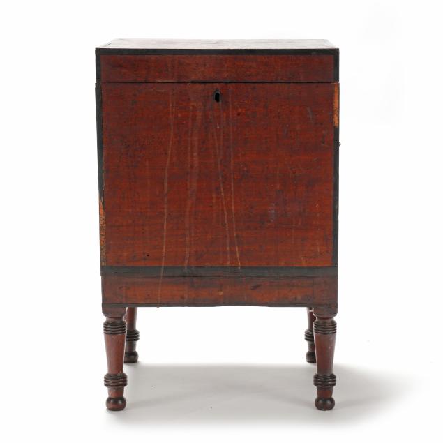 Circa 1820, mahogany veneer, pine secondary, the case and hinged lid with ebony banded inlay, open interior with partial red wash (cut outs from previous dividers, now absent), case sides with later ring handles, flush base with turned tapered legs.
