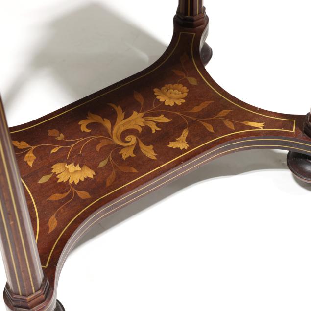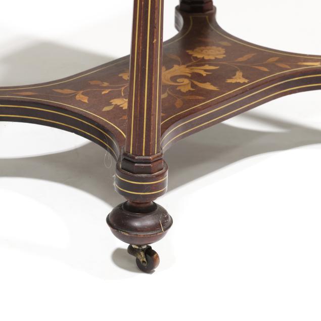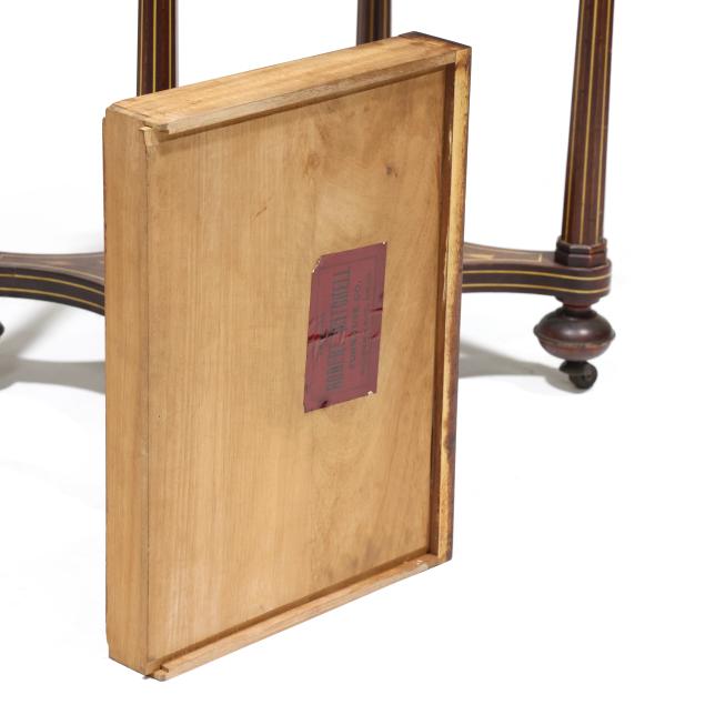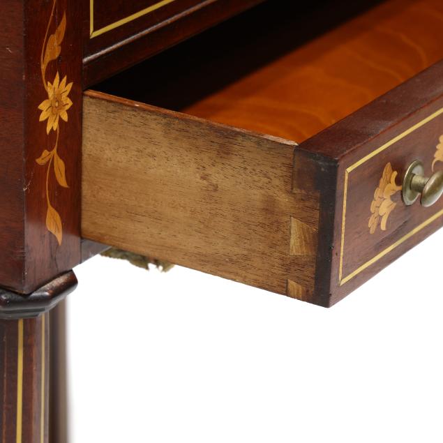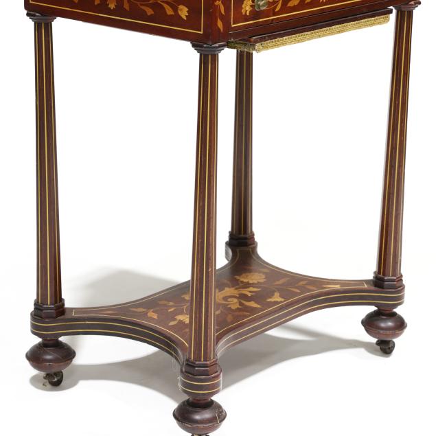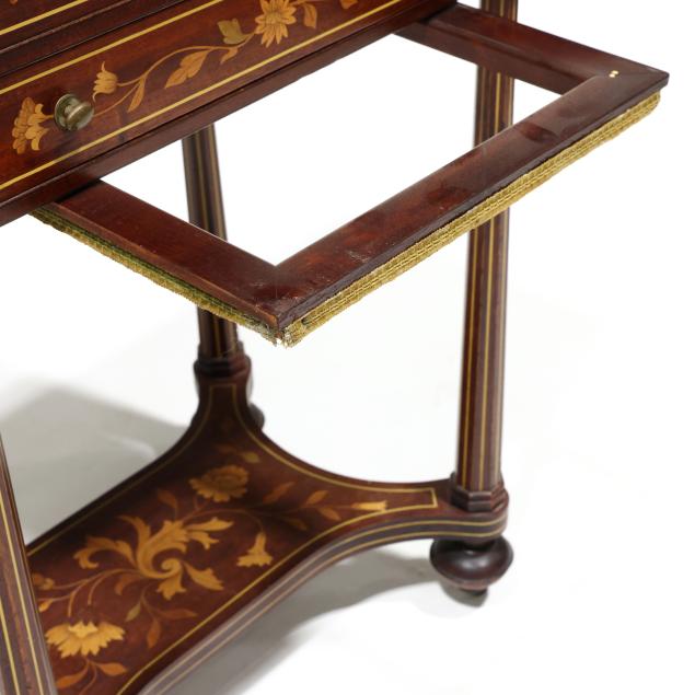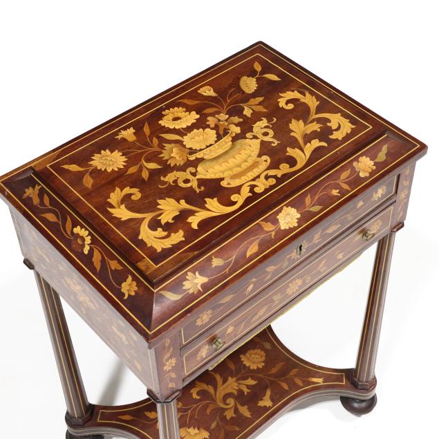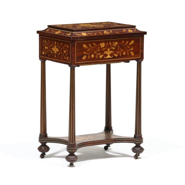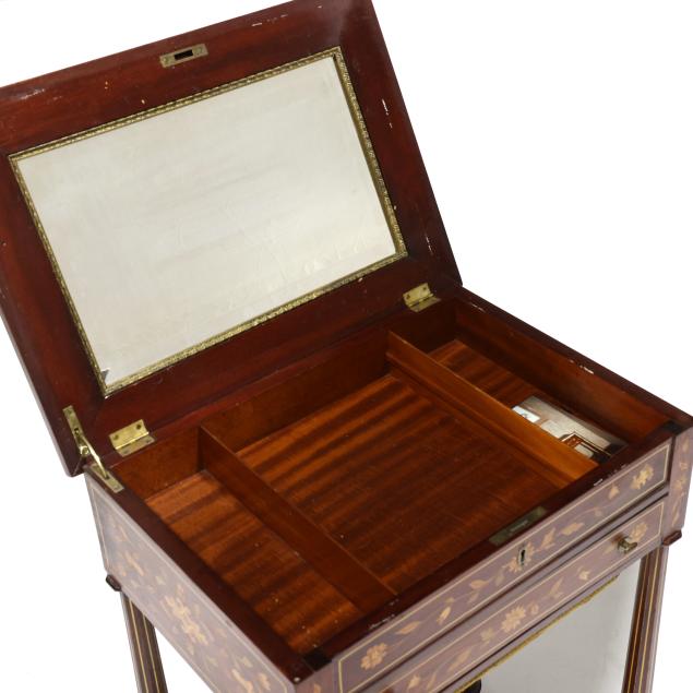 Early 20th century, hinged raised panel lid, mirrored and divided interior, lower drawer, pencil post supports, lower shelf, turned feet on casters, the whole with floral, vine and urn inlays decorated to all sides.