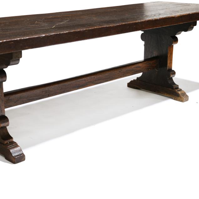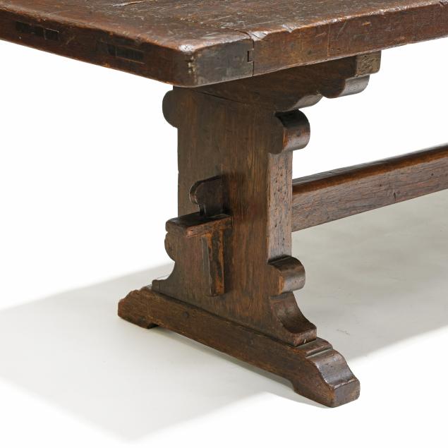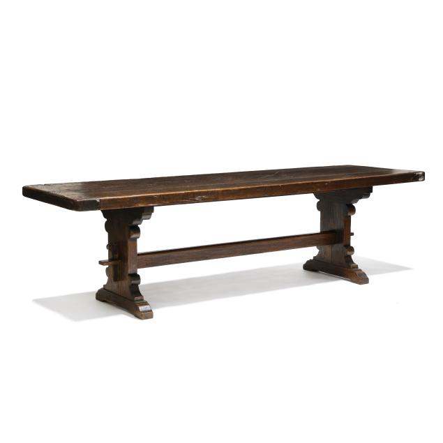19th century, two board top with bread board ends, trestle form base with through tenon joinery on shoe feet.