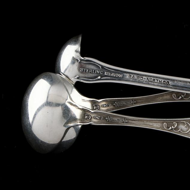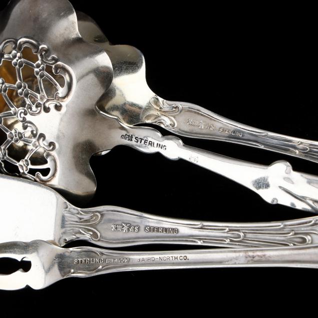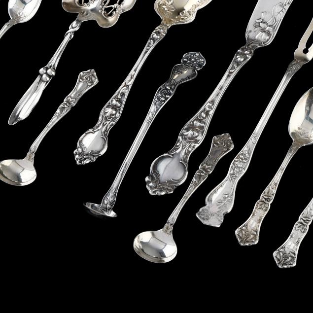 Violet sugar spoon with gold wash bowl and master butter knife, not monogrammed; a Whiting bon bon spoon with foliate handle and crosshatched bowl, not monogrammed; and a mustard ladle and lemon fork with retail mark of Baird North Co., not monogrammed.