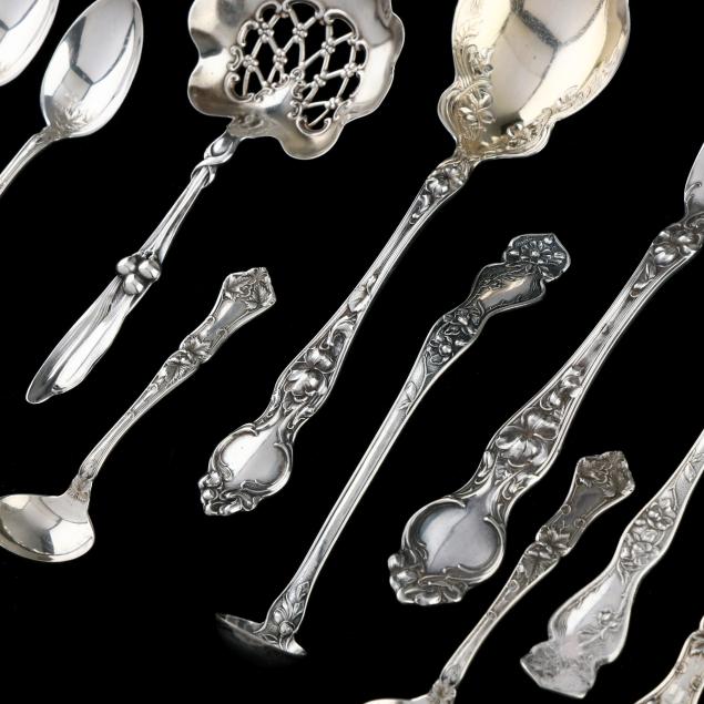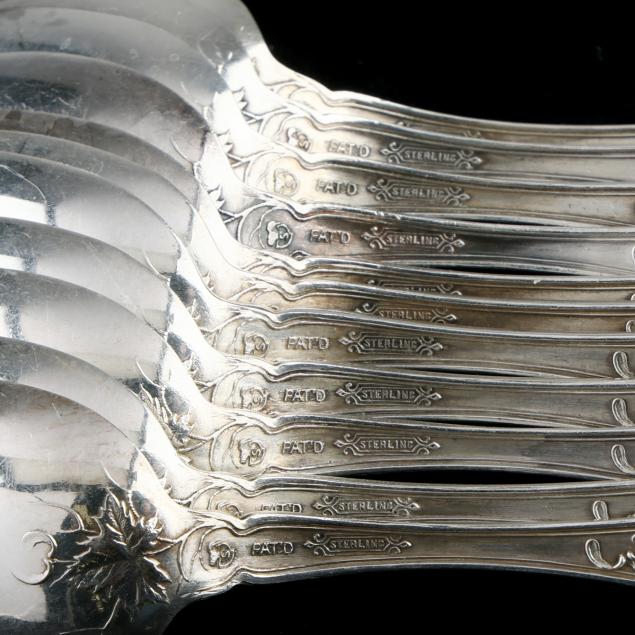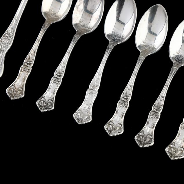 Includes (11) International demitasse spoons and (2) master salt spoons with foliate vine motifs, monogrammed; a Wallace