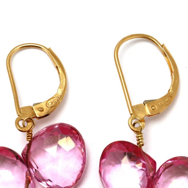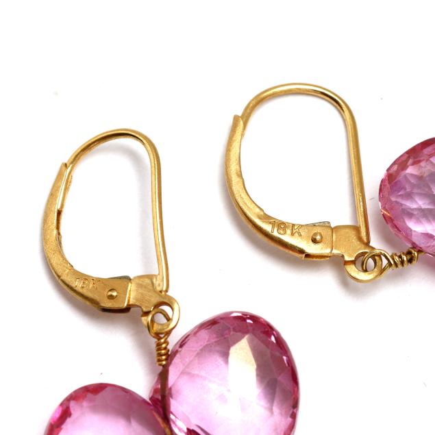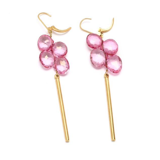 The gold lever back earrings suspending four pear cut pink topaz beads, and further suspending a gold tube drop, lever backs stamped 18K and with a maker's mark.