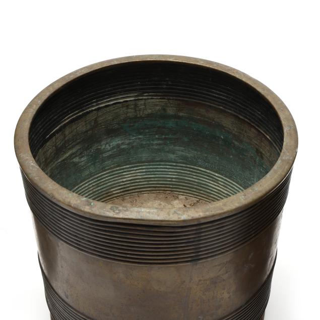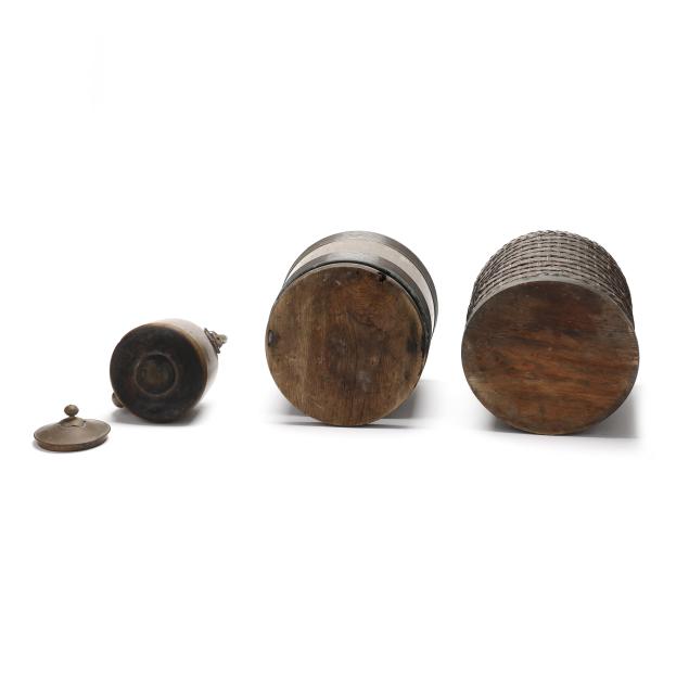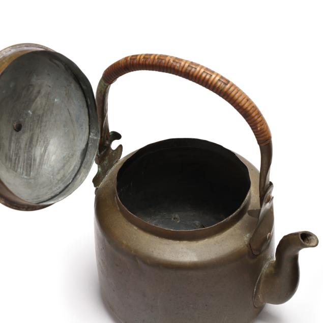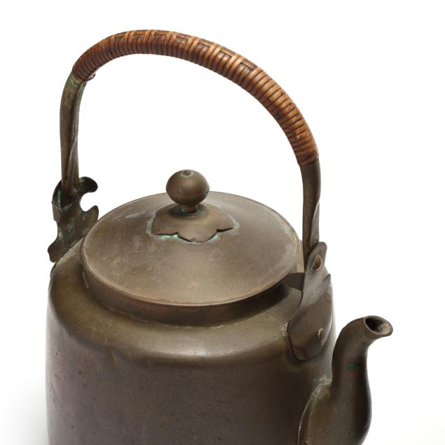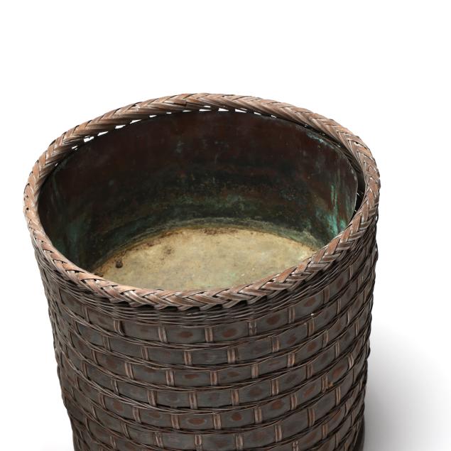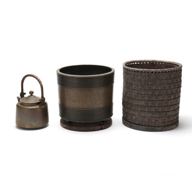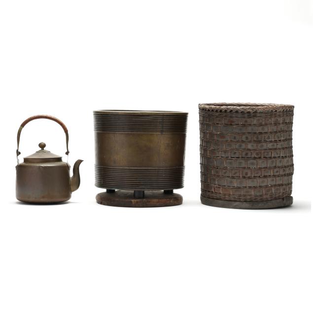 All hibachis with surface wear to exterior, metal inserts with wear and verdigris, small scattered cracks to interior wood components; smallest hibachi with some gapping at joints, later wood repair to inner rim; largest hibachi with some gapping to underside and undersides of a few drawers; teapot with a few small spots of verdigris, small loss to caning around handle; wood base to footed pot with chips and wear, pot with scattered verdigris to interior; metal insert to basket with verdigris.