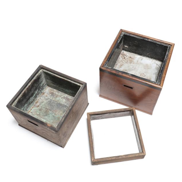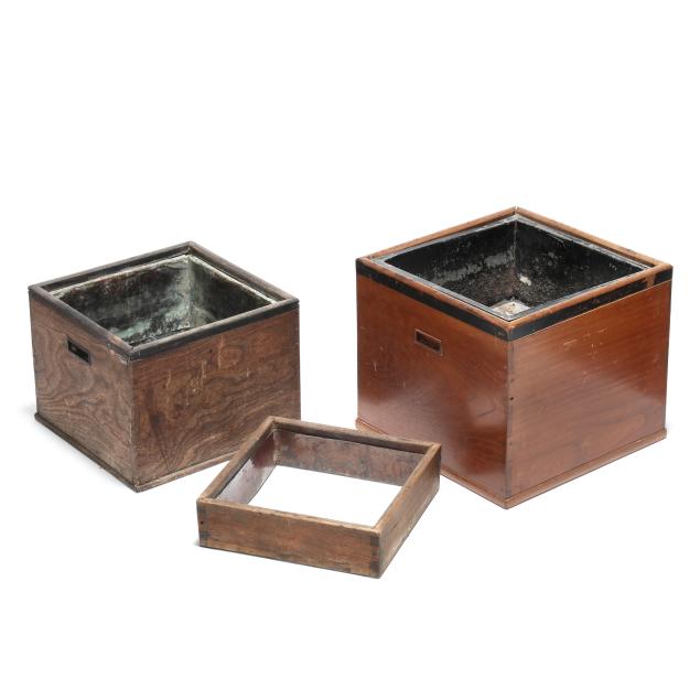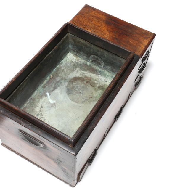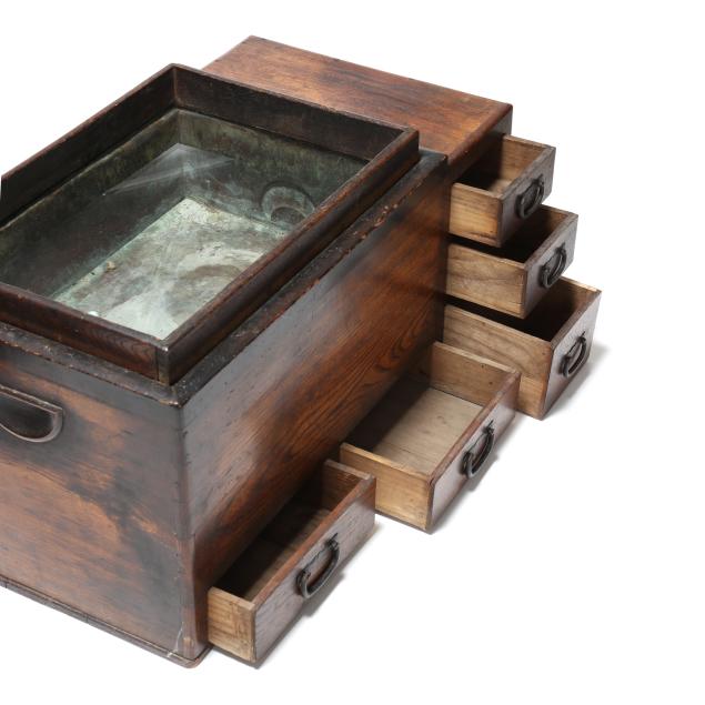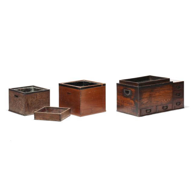 19th or 20th century, a traditional Japanese home rectangular hibachi with elements and accessories, the hibachi (smallest elm 12 1/2 x 12 3/4 in.; medium wooden section 12 5/8 x 14 1/4 in.; largest elm 14 x 26 3/4 x 14 1/4 in.), and teapot (8 3/4 x 7 x 6 in.), footed pot on wood plinth (9 1/2 x 9 1/2 in.), and a basket with metal insert (10 1/4 x 9 3/4 in.)