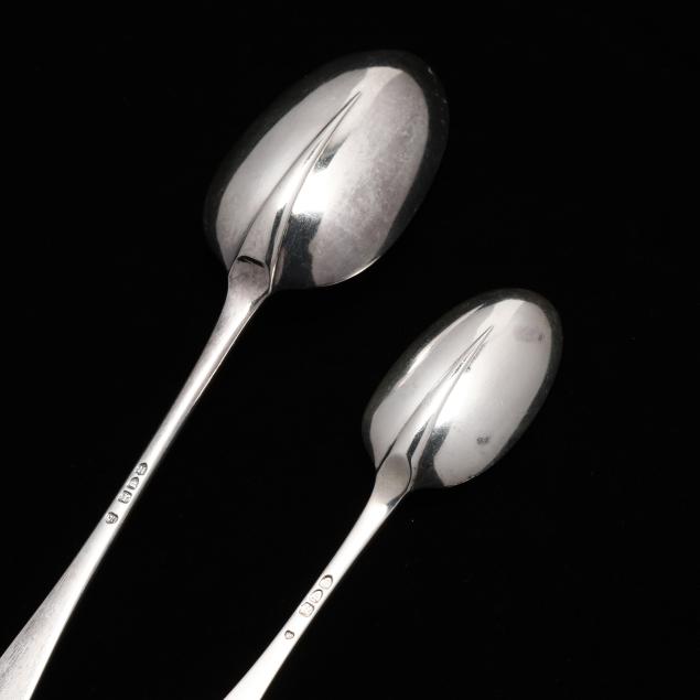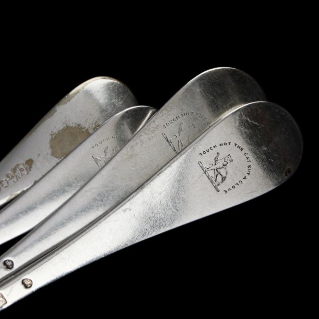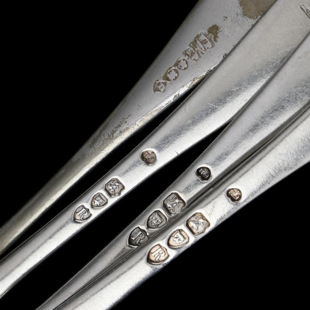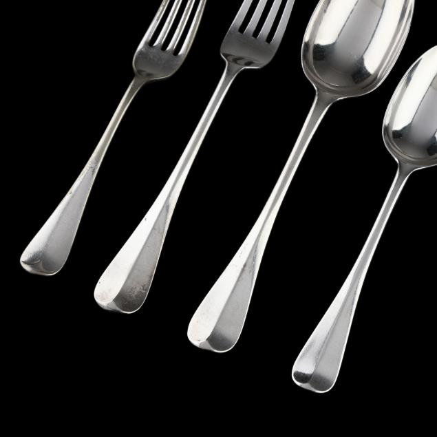 London (1892), each featuring the armorial monogram of Clan Macpherson "Touch Not the Cat but a Glove"; (84) pieces to include: (24) table forks (8in.); (24) table spoons (8 in.); (19) dessert forks (7 in.); (15) dessert spoons (6 3/4 in.); and (2) gravy spoons; presented in a fitted flatware case with retail mark of Wilson & Gill, London. This lot also includes (2) silver plated forks in a similar pattern.