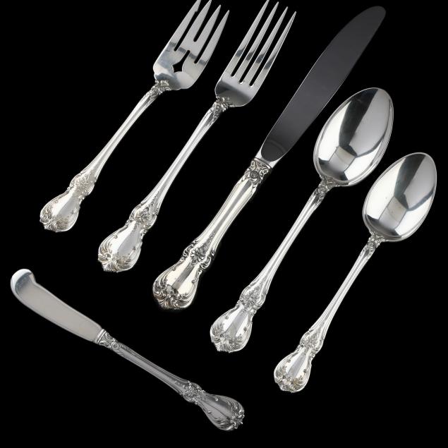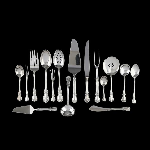 (86) pieces to include: (12) knives (8 7/8 in.); (15) forks (7 1/8 in.); (12) salad forks (6 3/8 in.); (15) teaspoons (6 in.); (11) round bowl soup spoons; a place spoon; a flat handle butter spreader; (5) tablespoons; a pierced tablespoon; a cold meat fork; a gravy ladle; a tomato server; a jelly server; a sugar spoon; a baby spoon; a master butter knife; a pickle fork; a lemon fork; a cheese knife; a (2) piece carving set; and a pie/cake knife. Not monogrammed, presented in a fitted flatware box.
