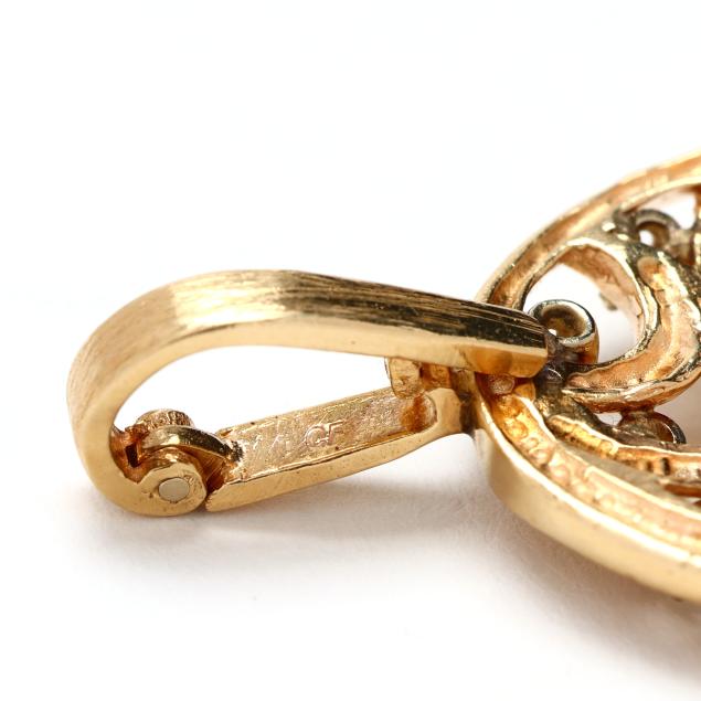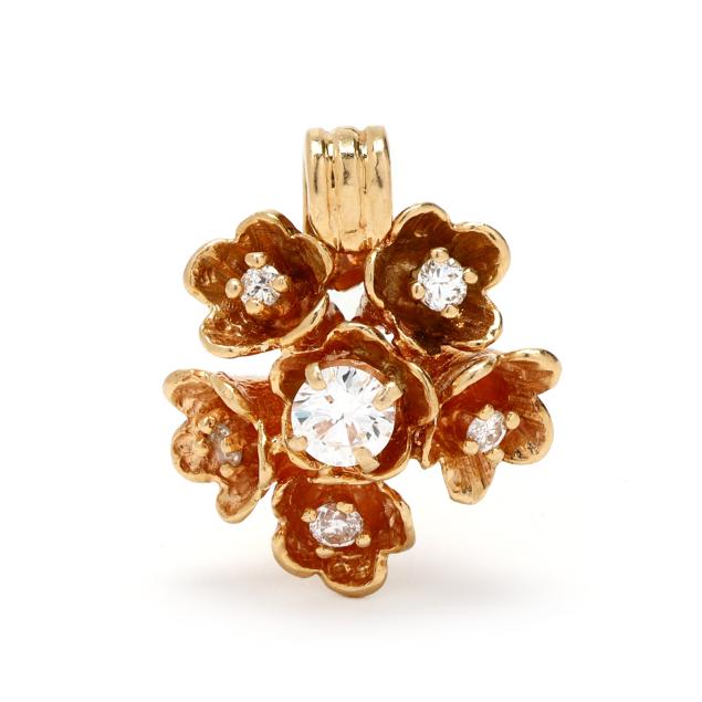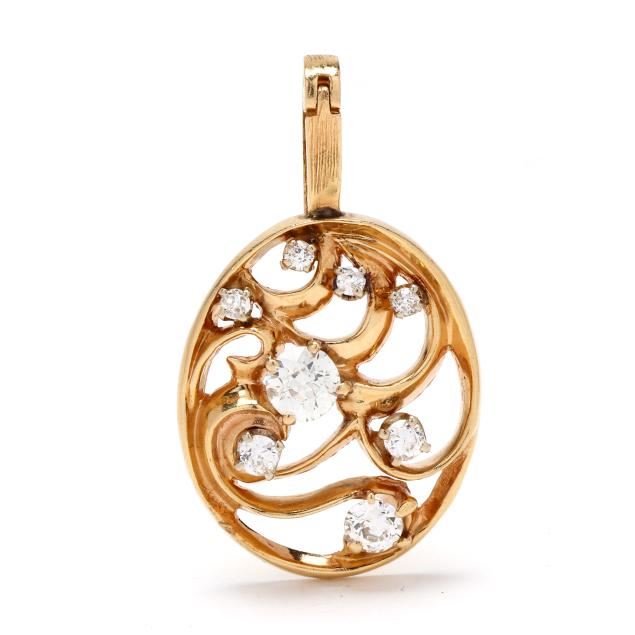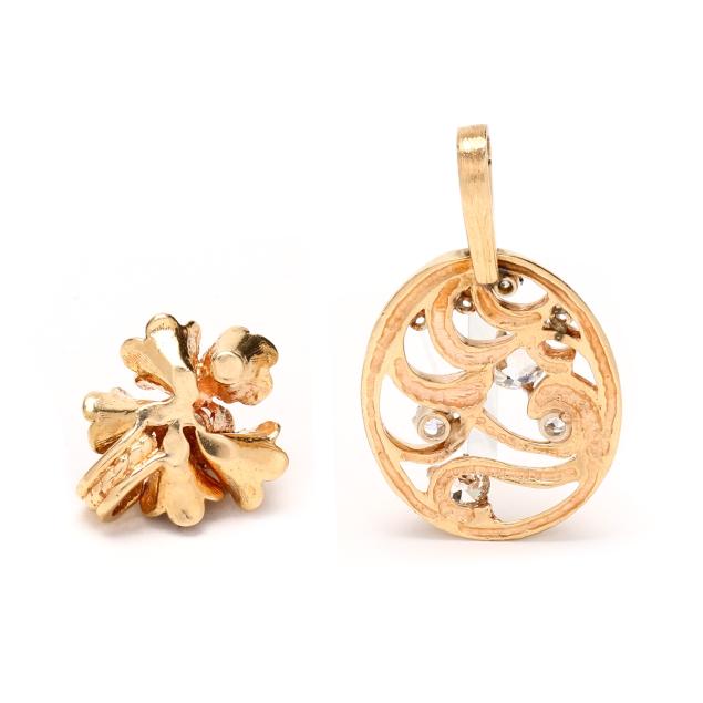 To include: an oval pendant with openwork design, scattered throughout with prong set old European and old mine cut diamonds weighing approximately 1.75 total carats (I-J color, SI2-I1 clarity), completed with a hinged bail, stamped CF and testing 14KT (1 5/8 x 7/8 in.) (some diamonds with chips and abrasions visible under 10x magnification); and a floral motif pendant, the flowers prong set with full cut round diamonds weighing approximately .75 total carat (G-H color, SI1-SI2 clarity), completed with a bail, testing 14KT (7/8 x .75 in.) (good estate condition).