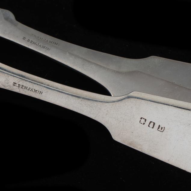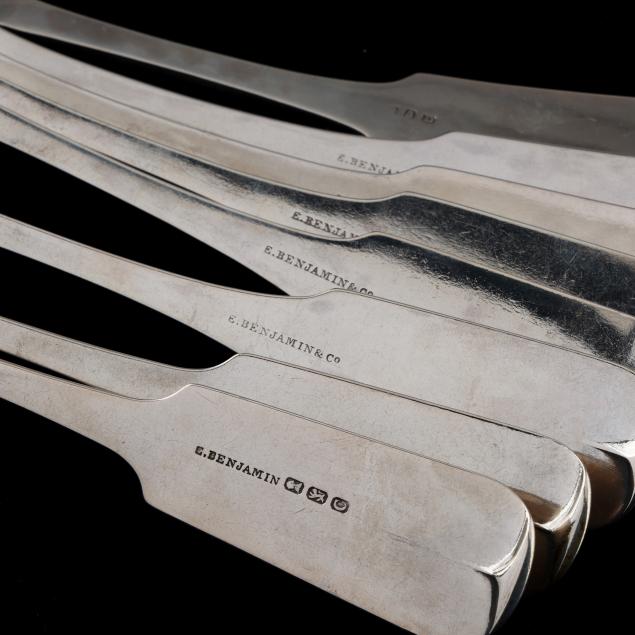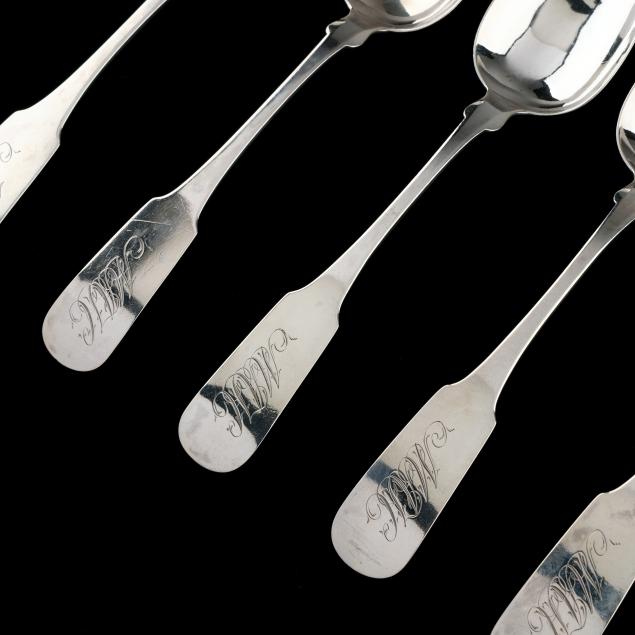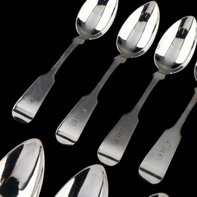 New Haven, Connecticut, circa 1840-1846; includes a set of (4) teaspoons with uniform period monogram and pseudo hallmarks of a star, acorn, D; (1) tablespoon with the same pseudo hallmarks; a set of (5) tablespoons with a shell back bowl and uniform period monogram; and a pair of tablespoons with a period uniform "EC" monogram and pseudo hallmarks of a bust, lion, and C.