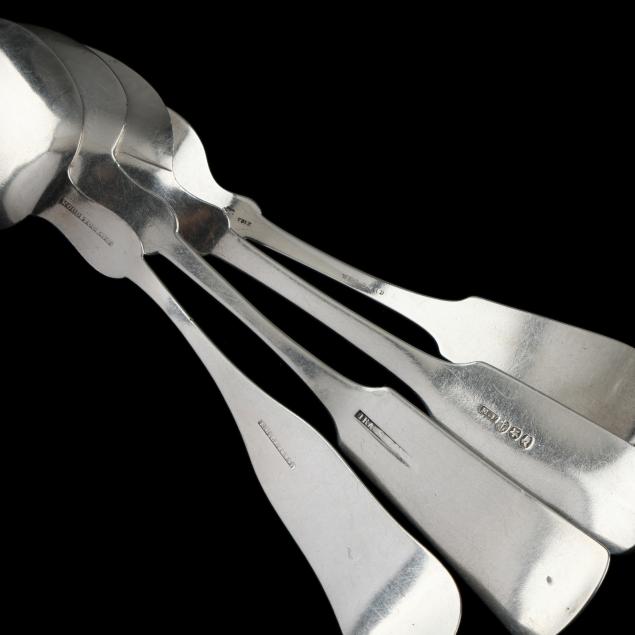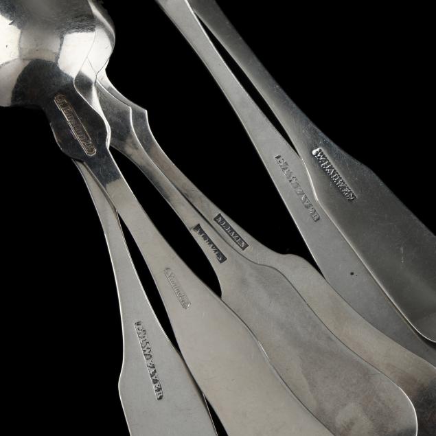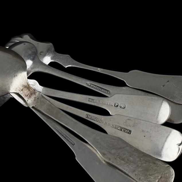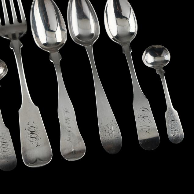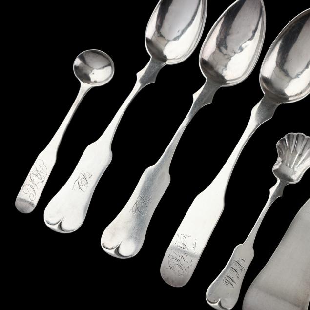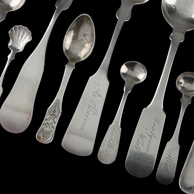 (16) pieces to include: all early to mid 19th century, (14) to include: (3) tablespoons with marks of Roswell H. Bailey, Woodstock, Vermont; Ira Strong Town, Montpellier, Vermont; Maltby Pelletreau, New York City; a pair of teaspoons by Nathan L. Hazen, Troy, New York and Cincinnati, Ohio; a teaspoon with mark of James Easton II, Nantucket, Massachusetts; a teaspoons by William Hadwen, Nantucket Island, Massachusetts; (2) teaspoons by Emmor T. Weaver, Philadelphia; (4) master salt spoons with marks of Horace Richomond, Canandaigua, New York; N. Olmstead, Farmington, Connecticut; Osman Reed & Co., Philadelphia; and Leach & Davies, Utica, New York; and one unmarked spoon with engraved handle; a master salt shell spoon, not marked; and a Whiting coin silver fork, retailed by William C. Byrd; assorted monograms and engravings.