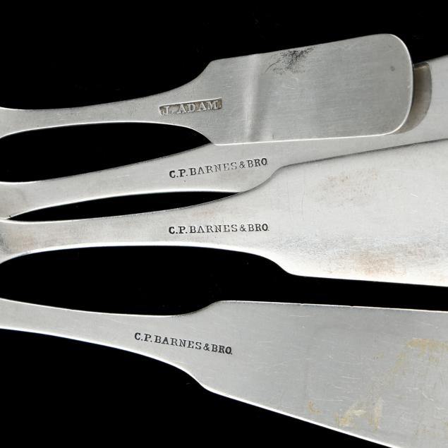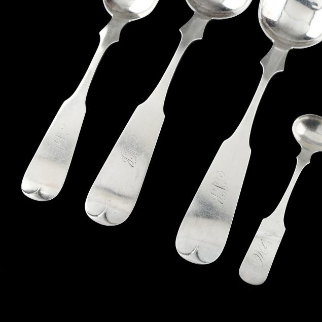 Includes (2) tablespoons and (1) place spoon with mark of Chauncey P. and Joseph Barnes, Louisville, Kentucky circa 1870-1880; all with period bright cut monograms; and a master salt spoon with mark of John Adam, Alexandria, Virginia, circa 1796-1848, with a period "LAC" monogram.