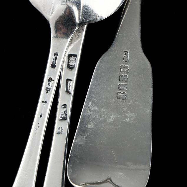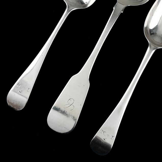 Includes a George I tablespoon, partially rubbed "M" maker's mark, London (1720); and a George II tablespoon, rubber maker's mark, London (1749); both a near pair with partial rattails and uniform "S I M" monograms; and an Irish William IV silver stuffing spoon, mark Charles Marsh, Dublin (1831), featuring a rattail and "C" monogram.