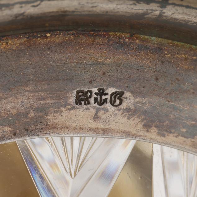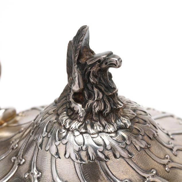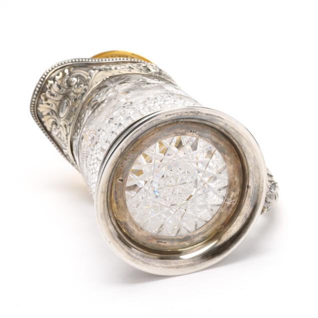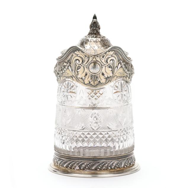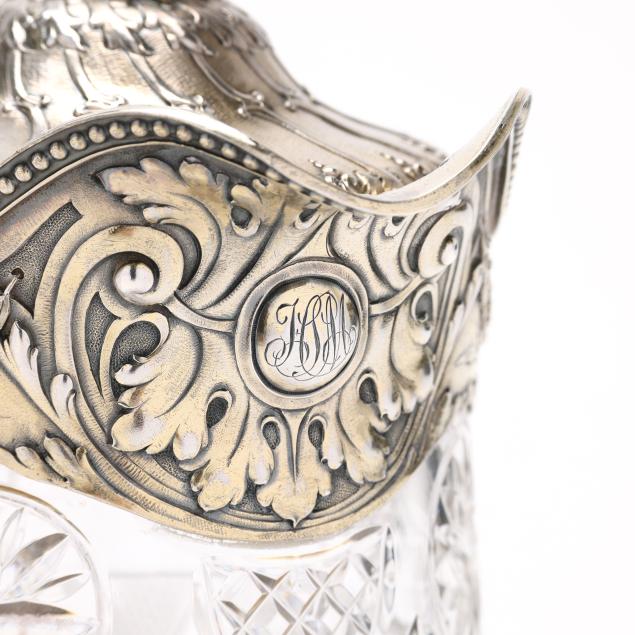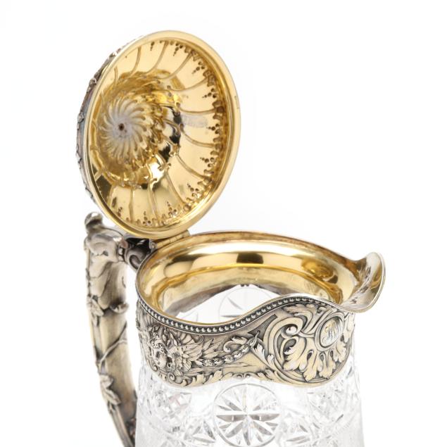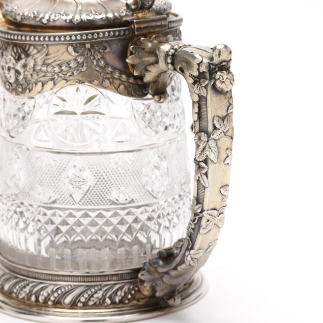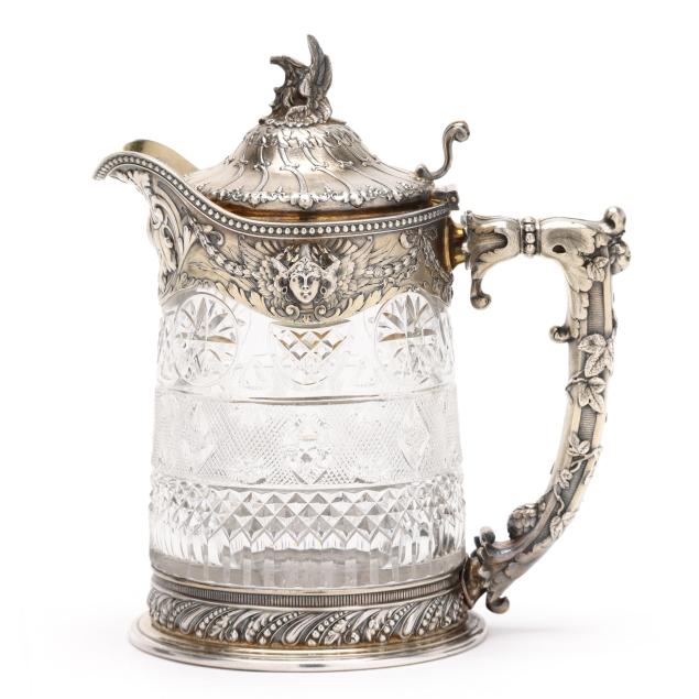 1893 date symbol, pattern number S1039, the glass body is intricately hand-cut with strawberry, sunburst, diamond and fan designs, the silver mounts include a hinged cover surmounted by the head of an eagle with upswept wings, the collar features winged masks of Victory amidst laurel swags, the handle wrapped by a trailing vine trailed by a hops bud, and the lower band with beaded and foliate design; period monogram "HSM" to small medallion beneath pouring spout.